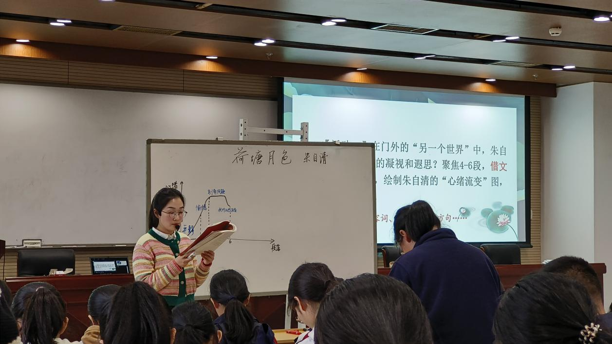 王钰老师以绘制“心绪流变图”为支架,以品味景中之情为主问题,探究了朱自清在散文中的困境与超越,携同学们共同完成了一场不寻常的《荷塘月色》审美之旅。课上,王钰老师从作者的出发和回归中巧妙抓住“门”这一介质,分三个任务展开探究。任务一,分辨门内门外的两重世界。该部分结合学生朗读品味和上台板书互动等活动设计,让学生借文观景,披文入情,探究门外审美世界景物描写的特点与作者的情感流变;任务二,感受门外世界的两方天地。该部分在品析真实荷塘之景的基础上,进一步引出回忆的“江南采莲”虚境;任务三,体悟门内门外的两种人生。该部分结合作者生平与写作背景,引领同学们感受景物背后作者的审美理想与现实困境。最后以知乎上的阅读困惑为引,结合单元内同样描写北京之景的散文,以真实生动的方式让学生学会:与文本建构关系时当存有包容开放的心态。其中,学生插画与课件的巧妙融合,课前音乐的导入与朗读音乐的播放,丰富的学生朗读等都体现了课堂的情境性。