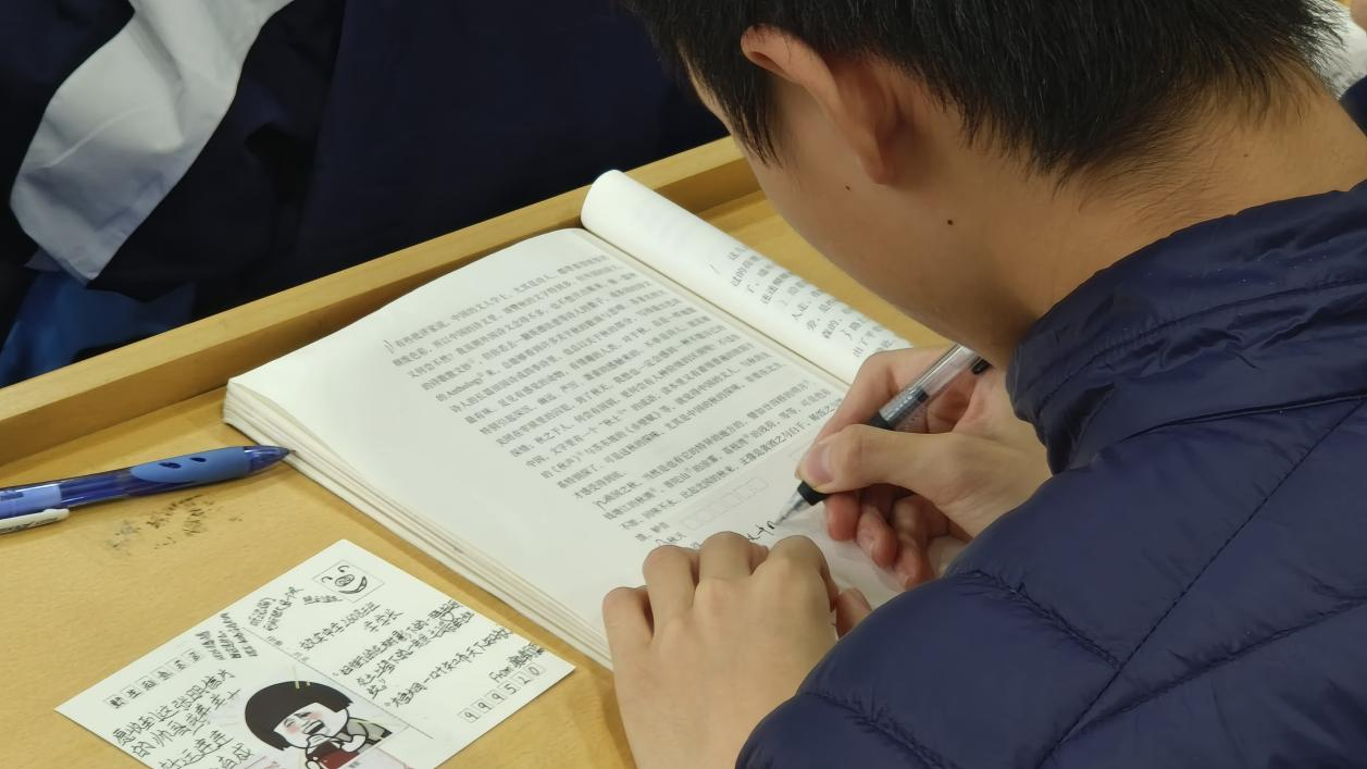 郑怡老师创造性地采用了跨课堂探究法,以品析文本意象、探究物我关系为主线,联结两地课堂,融入生动的声音艺术,开启了一场读写结合、别开生面的《故都的秋》之旅。课堂以特制的金句热搜为引,共分成三个部分。活动一,依托视频和明信片实现两地学生的共诵共读。活动二,引导学生在第一人称的语言表达中完成与“达夫”的跨时空对话,结合蝉声再现、选择插图、明辨诗句等活动设计,教学情境真实生动。活动三,通过仿写课文、回复明信片等真实的语言实践活动,真正实现让学生在创造中成长。郑怡老师幽默生动的上课风格给在座的师生留下了深刻的印象,无论是充满生命力的朗读、歌声与蝉声模拟,还是对标题“故都”到“孤独”的个性化理解,抑或是应对意外的教学机智,都使阶梯教室充满了其乐融融的氛围。