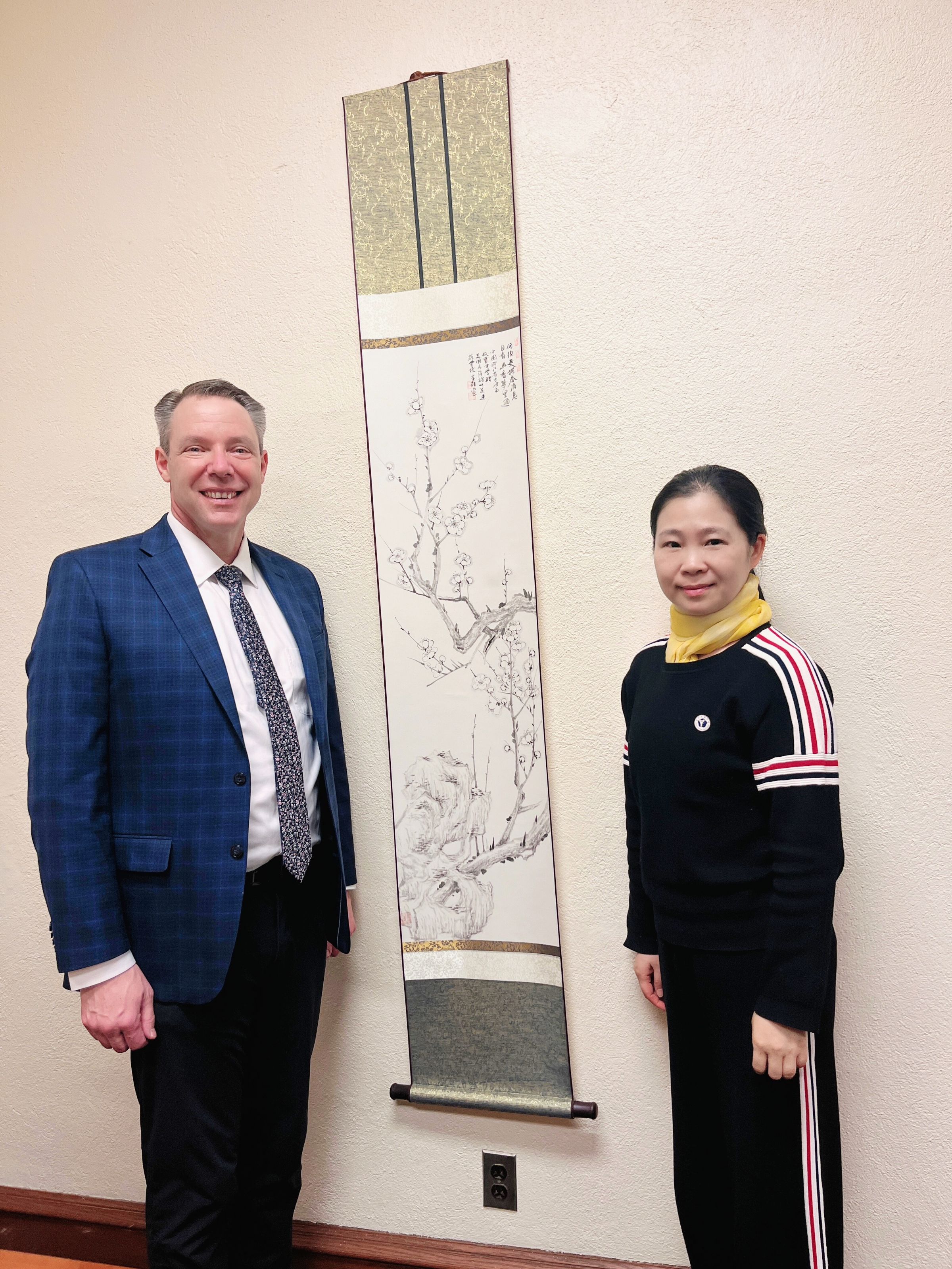 张悦校长代表学校赠送宋鑫老师创作的《梅花图》,该作品以南宋诗人张道洽的诗句“何须更探春消息,自有幽香梦里通”作为主旨,暗合效实校花梅花的精神寓意。