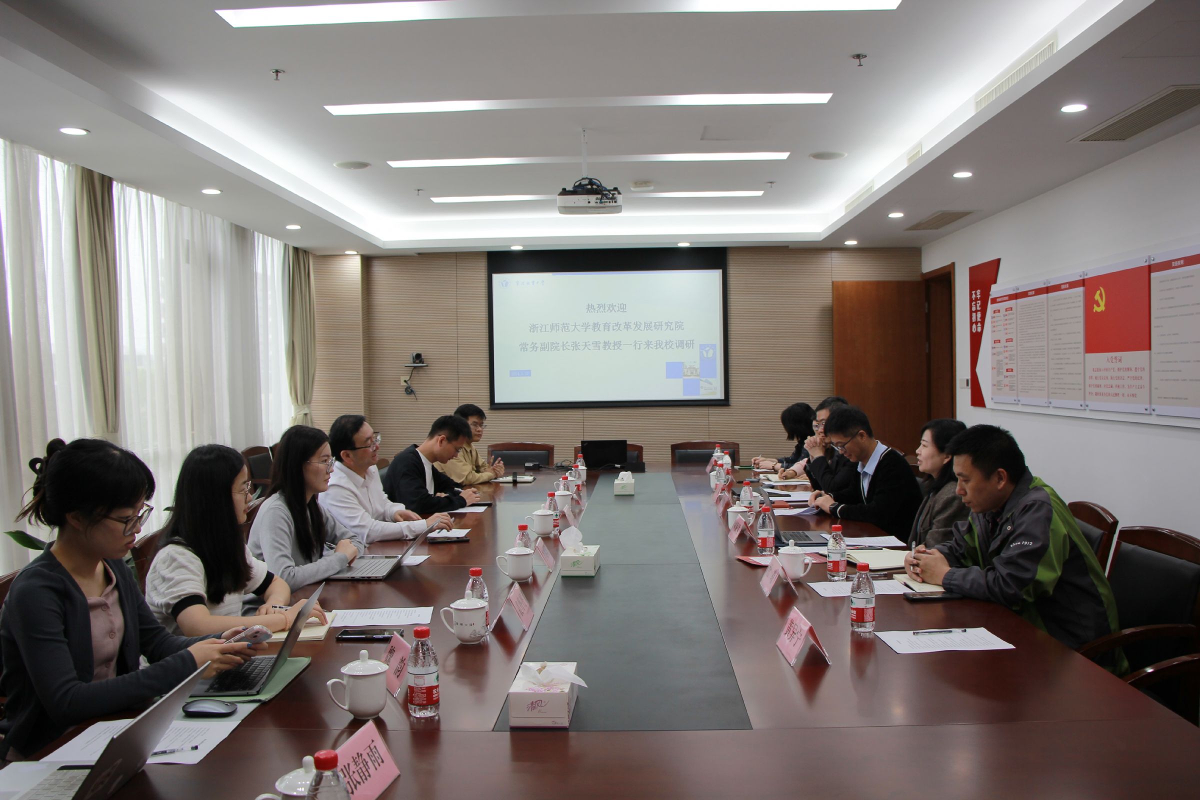 4月22日,浙江师范大学教育改革发展研究院常务副院长张天雪教授一行7人来到我校进行集团化办学调研。林佩君副校长、黄琪锋副校长、党政办徐玲玲主任、教务处余斌主任、学生处杜靖副主任、教科处刘怡副主任、后勤装备处黄异宁副主任参加此次调研活动。