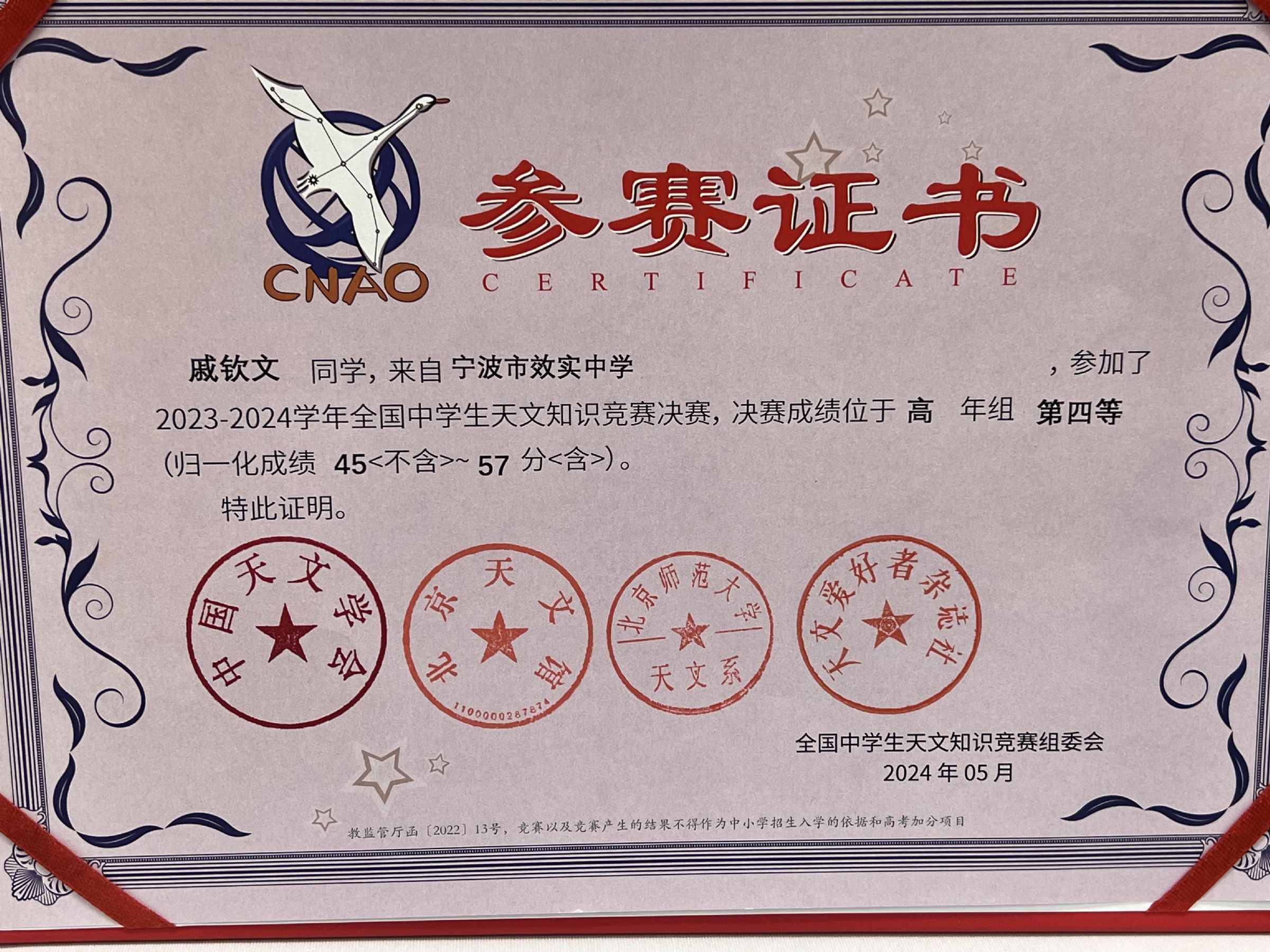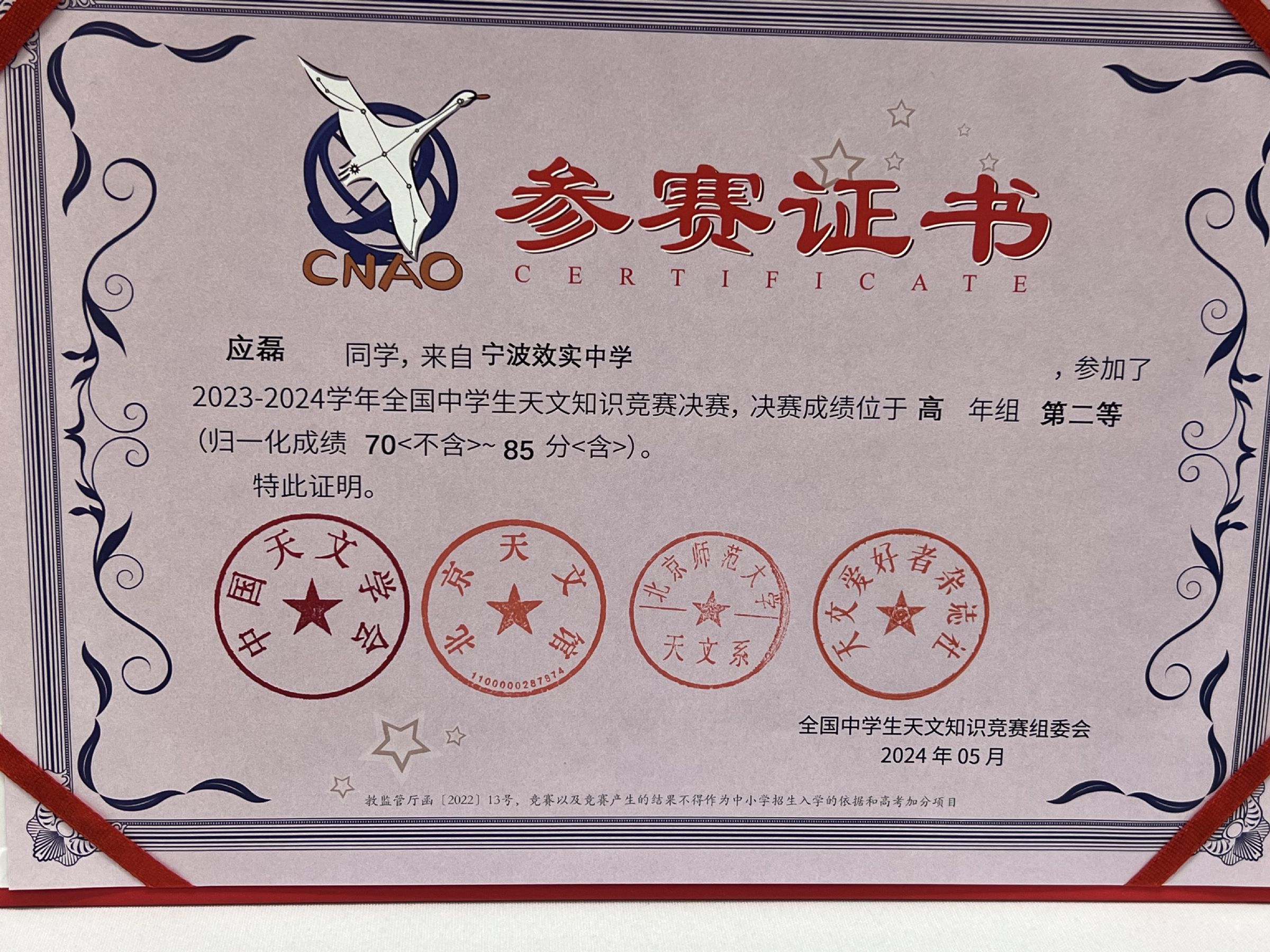 经过紧张激烈的理论笔试和观测考试,最终有115位同学获得全国一、二、三、四等奖。宁波效实中学队获得佳绩,全员获奖,其中我校东部校区D2608应磊同学获得全国中学生天文知识竞赛二等奖、D2601戚钦文同学、D2503贾文涛两位同学获得全国中学生天文知识竞赛四等奖。