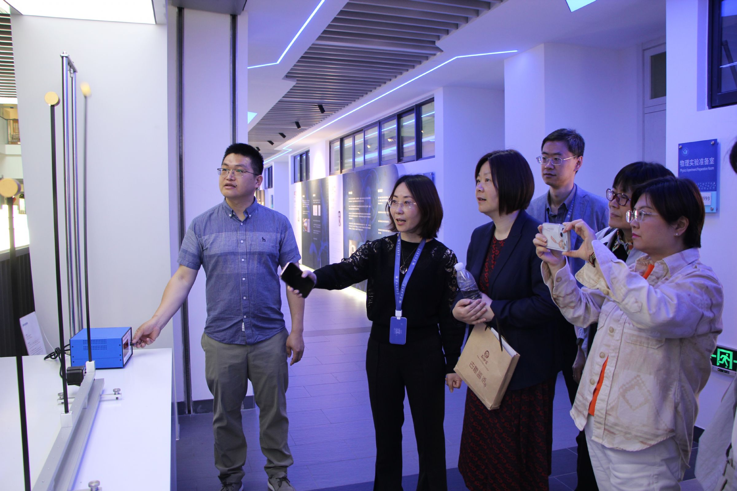 考察团一行在袁张瑾老师等的陪同下,参观了我校东部校区海洋生物展示馆、物理学科走廊、杰出校友浮雕墙等地,并亲自动手体验了物理学科走廊上的辉光球、魔术桌、电磁加速器、调频共振杆演示器等实验仪器,深入了解我校在物理实验方面的教学特色与创新实践。