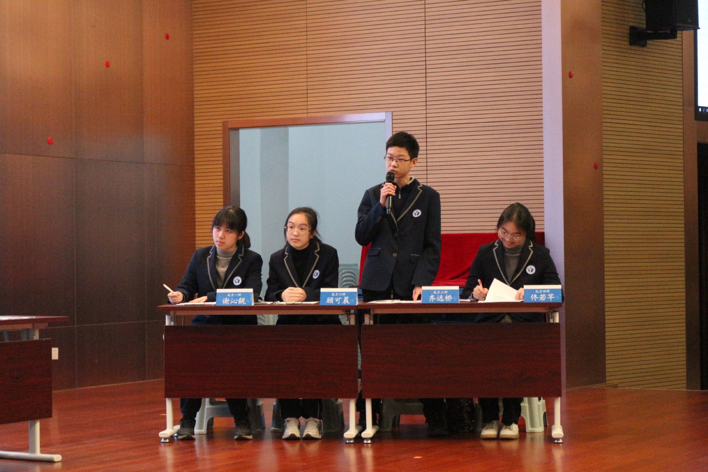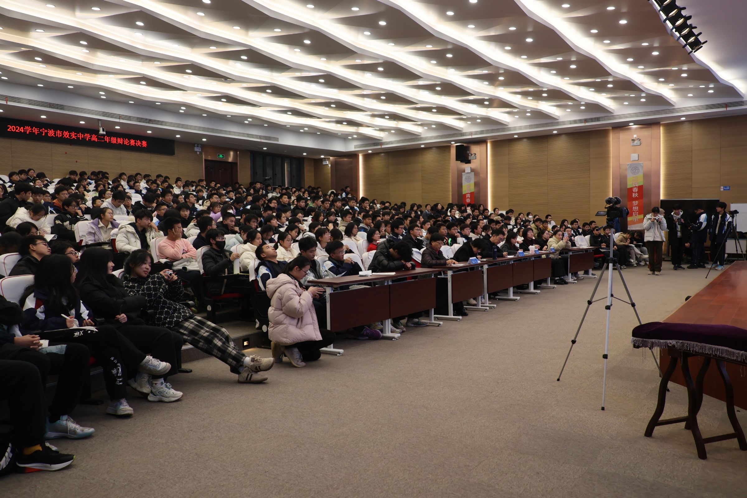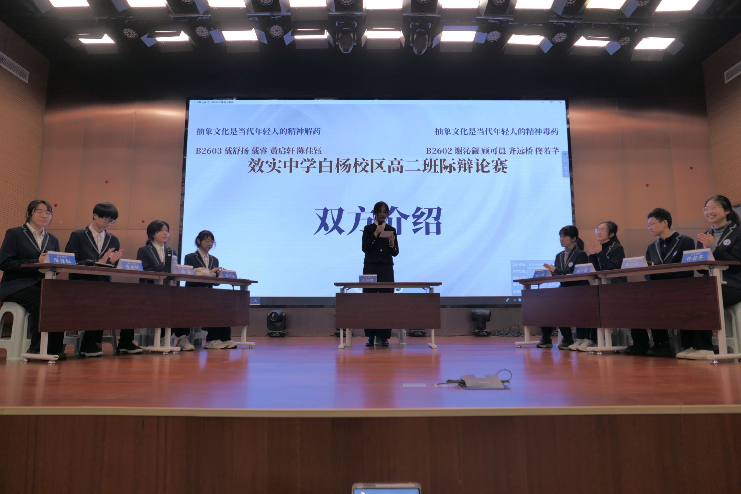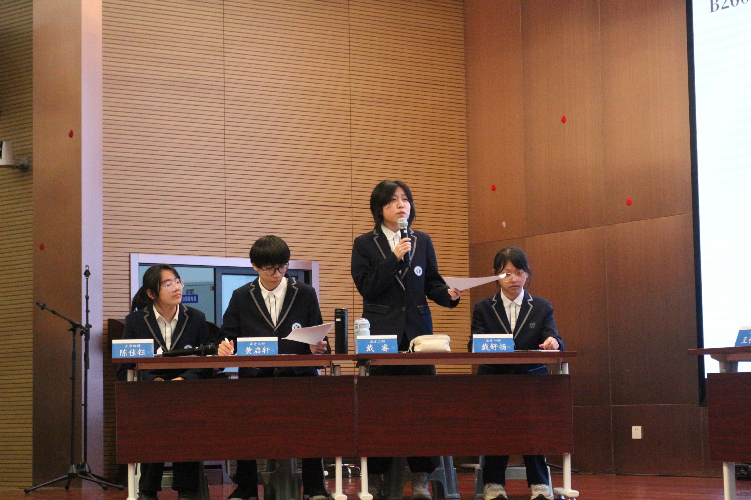 双方辩手在场上唇枪舌剑、你来我往,场面精彩纷呈,在思维碰撞之间彰显当代效实学子的思辨能力、表达能力与青春活力。