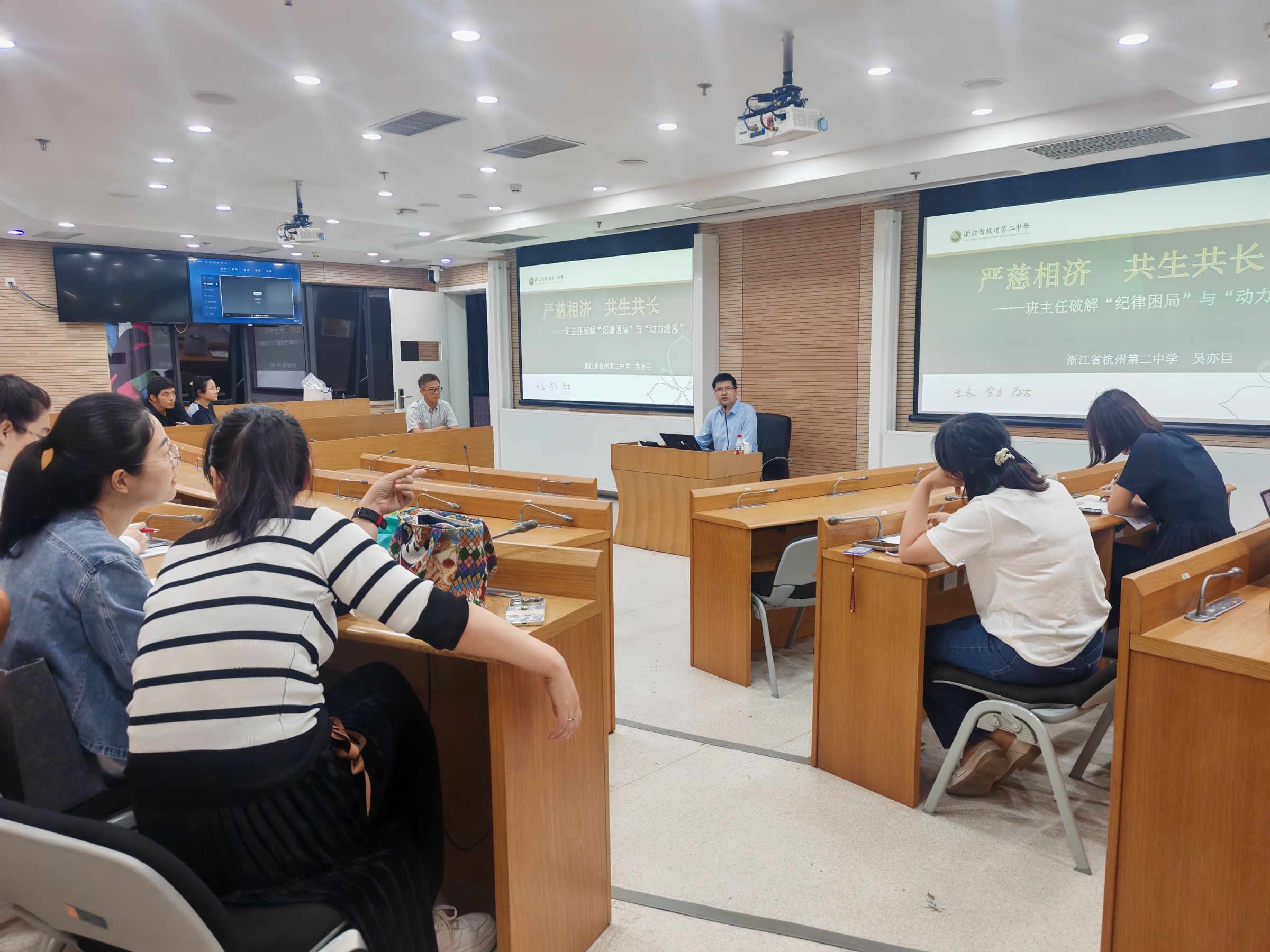 2025年5月28日,我校邀请到了杭州第二中学滨江校区教学主任吴亦巨老师为两校区班主任一场题为《严慈相济 共生共长——班主任破解“纪律困局”与“动力迷思”》的班主任工作主题讲座。讲座围绕班主任工作的核心使命、班级管理策略以及师生共长的新生态展开,为在场教师提供了丰富的教育理念和实践经验。