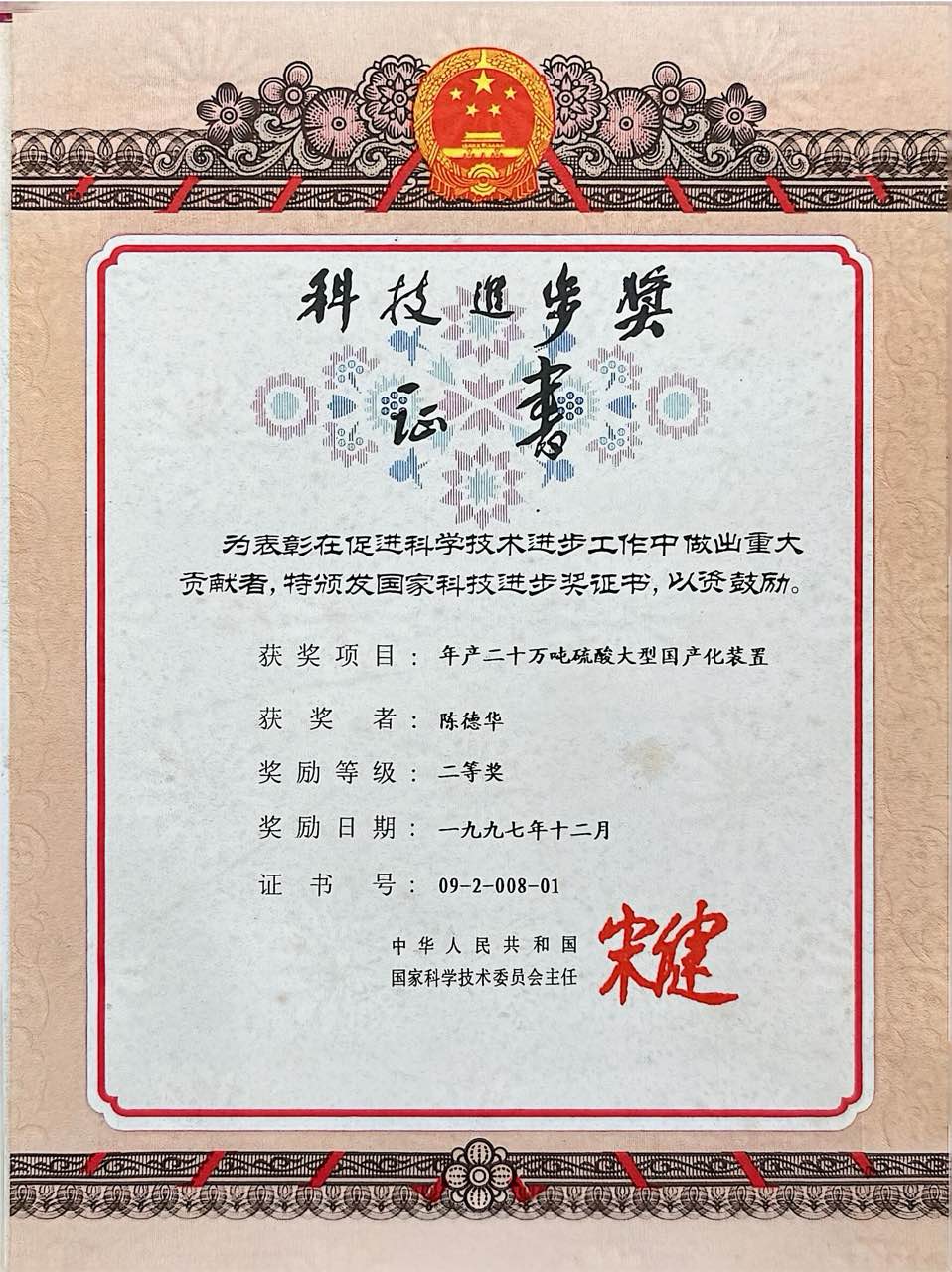 陈德华,教授级高工,国家工程设计大师,“八五”科技攻关先进个人,享受国务院特殊津贴。1957年,浙江大学毕业后进入化工部化工设计院工作。1965年调至化工部第三设计院(现东华工程科技股份有限公司),任工艺室主任、副总工程师等,在合成氮磷复肥、硫酸行业中有很高威望。参加大中型项目30余项,在安庆合成氨等多项引进项目中任工艺主谈,决策重大方案,解决技术难题。其中的大型硫酸装置国产化设计,获国家科技进步二等奖。