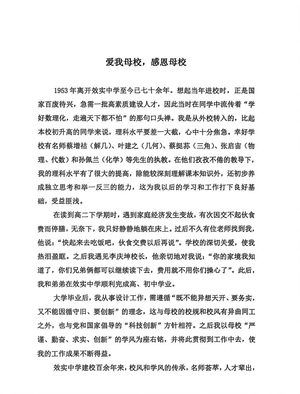 “在老师们孜孜不倦的教导下,我的理科水平有了很大的提高,除能较深刻理解课本知识外,还初步养成独立思考和举一反三的能力,这为我以后的学习和工作打下良好基础,受益匪浅。”陈老在给母校的信《爱我母校,感恩母校》中这样写道。