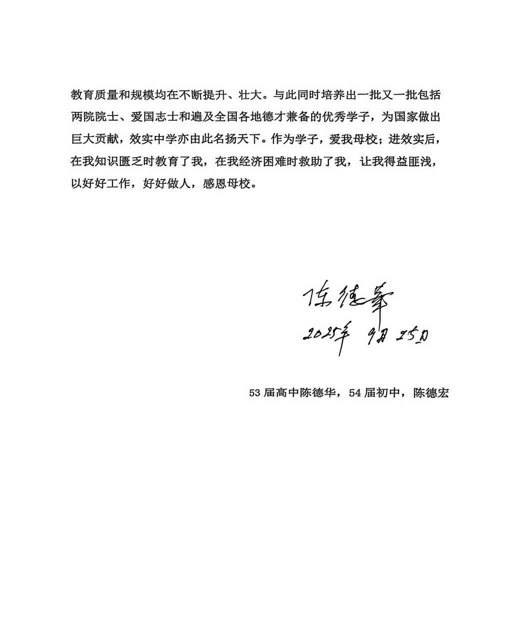 七十载光阴似水,却冲不淡一颗赤子之心。“作为学子,爱我母校;进效实后在我知识匮乏时教育了我,在我经济困难时救助了我,让我得益匪浅。”93岁的陈德华校友用最朴素的行动,续写了一段跨越世纪、历久弥新的母校情,更是“求适务实,与日俱进”效实精神在教育长河中生动的延续。