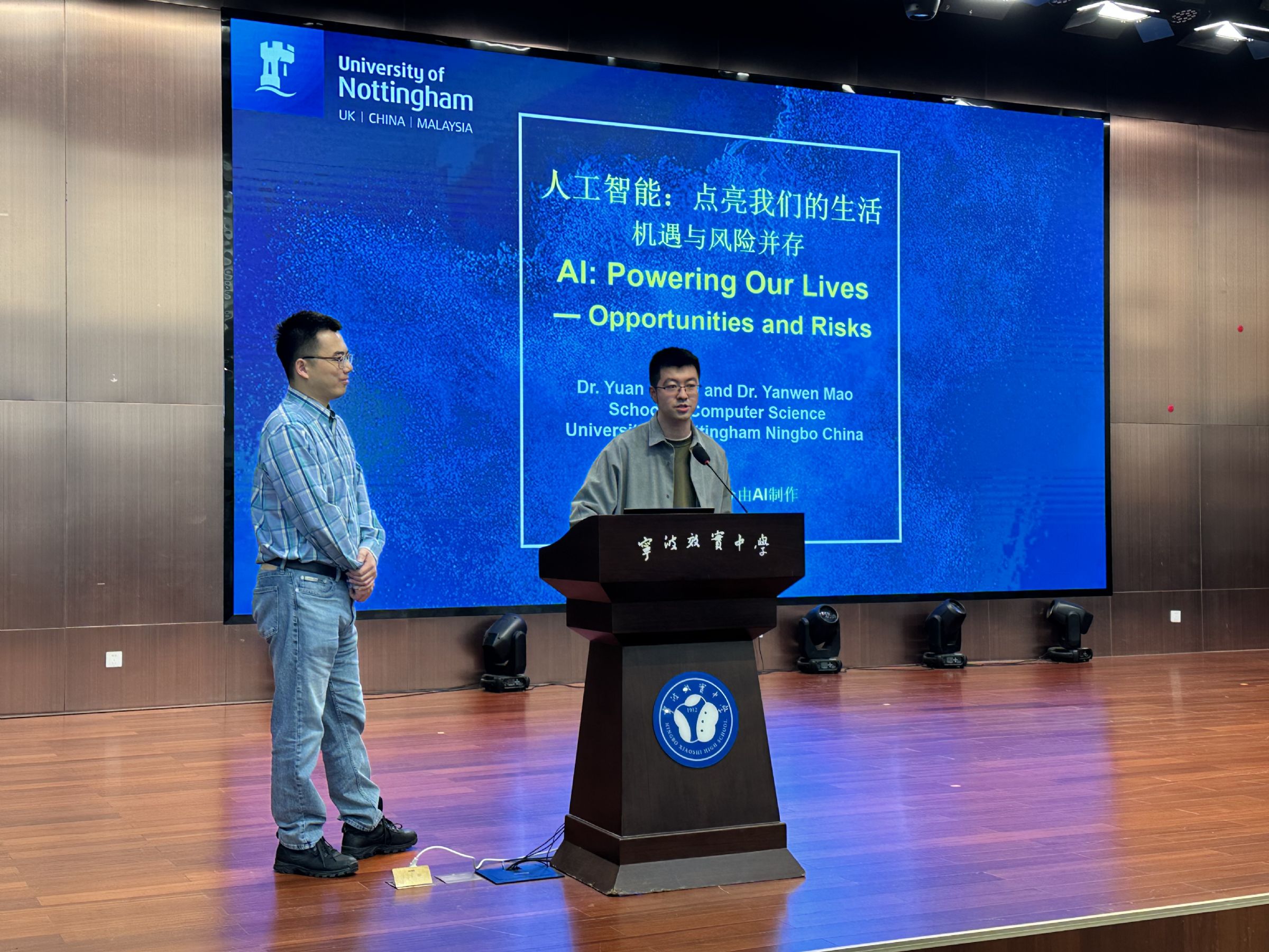 11月14日上午,宁波效实中学白杨校区中山厅迎来一场聚焦人工智能的精彩讲座。本次活动以“人工智能:点亮我们的生活——机遇与风险并存”为主题,邀请2004届校友程远博士与2013届校友毛炎文博士联袂主讲,带领同学们走近AI技术的现实应用与未来挑战。