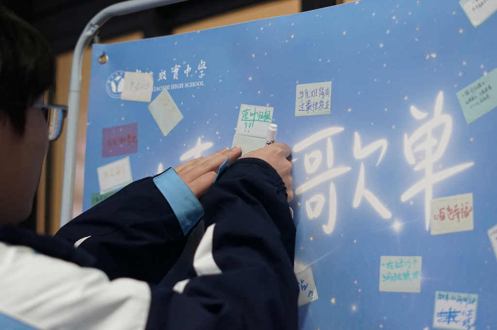 “情绪歌单”活动中,同学们用便利贴写下自己喜爱的、与情绪相关的歌曲,并附上推荐理由,分享音乐带来的力量与慰藉。