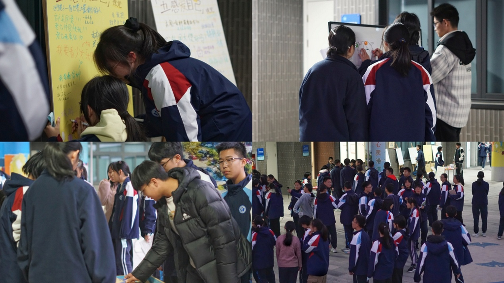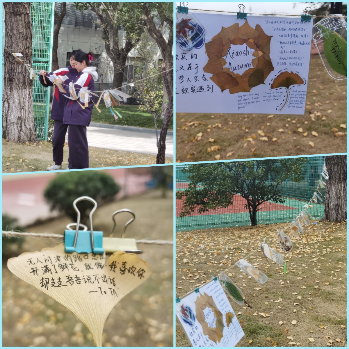 叶落成韵寄语活动中,同学们将生活的领悟或是祝福与心愿写在落叶上,悬挂于校园林荫道,形成独特的“心理树洞”。一片片承载着少年心事的落叶,成为校园秋日里最温暖的风景。