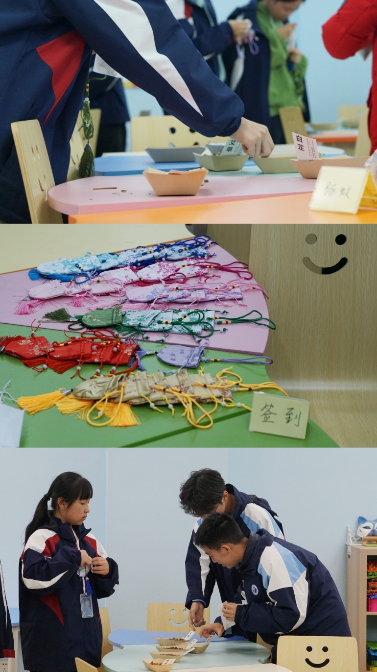 疏肝解郁、安神助眠、提神醒脑、驱蚊……在“DIY香囊”活动中,同学们可以根据自身需求选择不同种类的香料,亲手制作独一无二的香囊,感受传统文化的魅力。