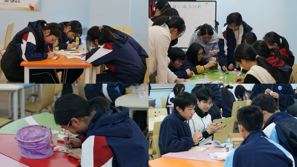“静心减压时刻”活动中,同学们通过曼陀罗涂色、水画涂色、超轻黏土等艺术疗愈创作,释放压力,找回内心的平静。