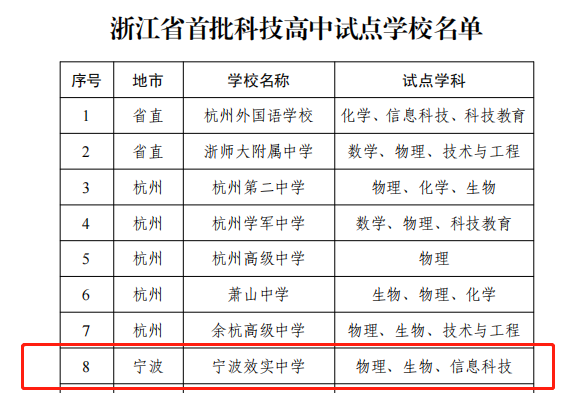 近日,浙江省教育厅公布首批科技高中试点学校名单,效实中学榜上有名。经过学校积极申报、宁波市教育局统筹推荐及省级严格评审,效实中学凭借深厚的科技教育底蕴与丰硕的拔尖创新人才培养成果从全省600余所普通高中中脱颖而出,成为29所试点学校之一。