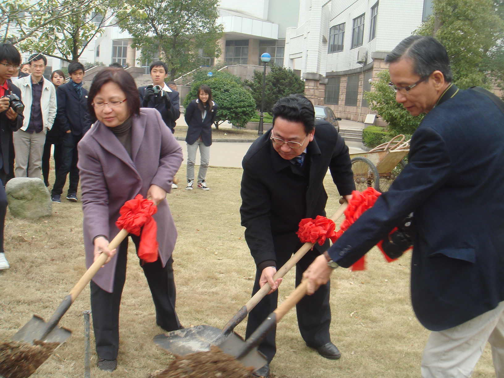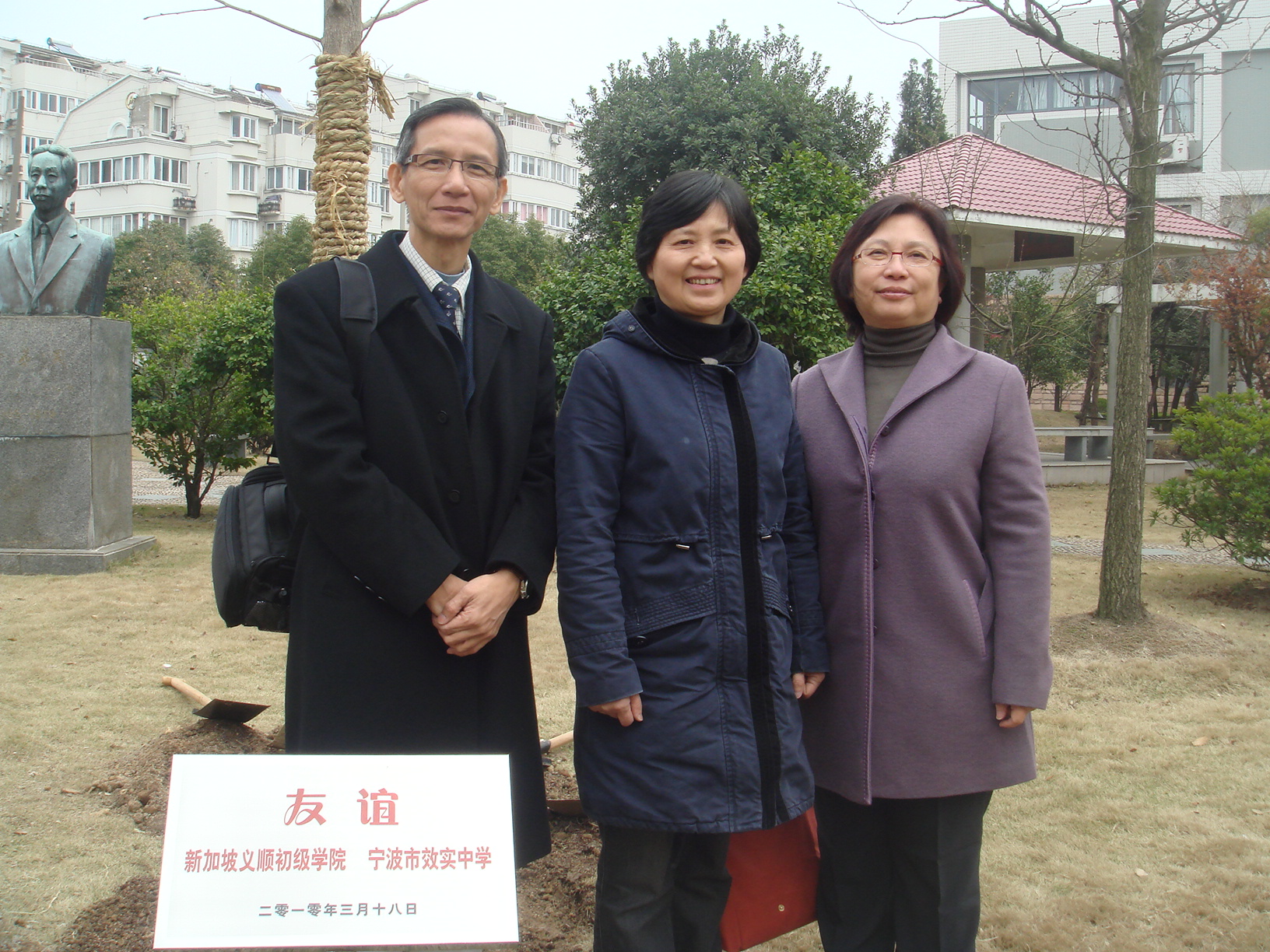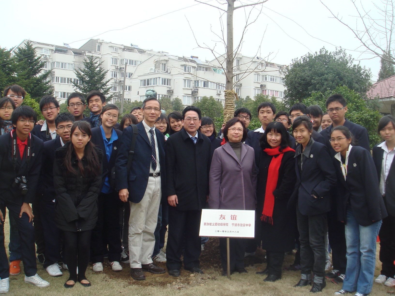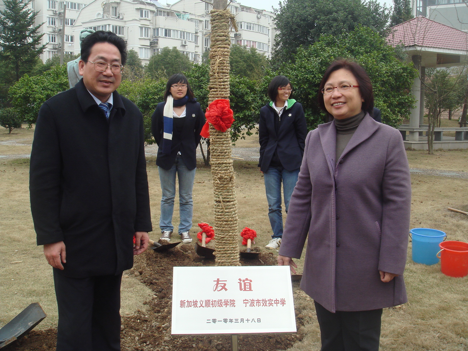 随后,义顺初院的院长许迪秀女士也专程来到我校访问,并与我校校长章才根共同签署了新的交流协议。两校虽然都经历了校长的更替,但相互间的友好交流和合作将源远流长。为此,两位校长和新加坡的学生共同在效实园里种下了校树---银杏。尽管乍暖还寒,这棵树才刚吐新芽,但它承载着两校六年的友谊和对未来的共同的期盼,一定会绽放出最绚丽的“花朵”。这也是我校与友好学校共同种下的第四棵友谊树。之前,已经有分别刻着德文、法文和英文“友谊”的树在此扎根,分别代表我校在德国、法国和香港特别行政区的三所友好交流学校。