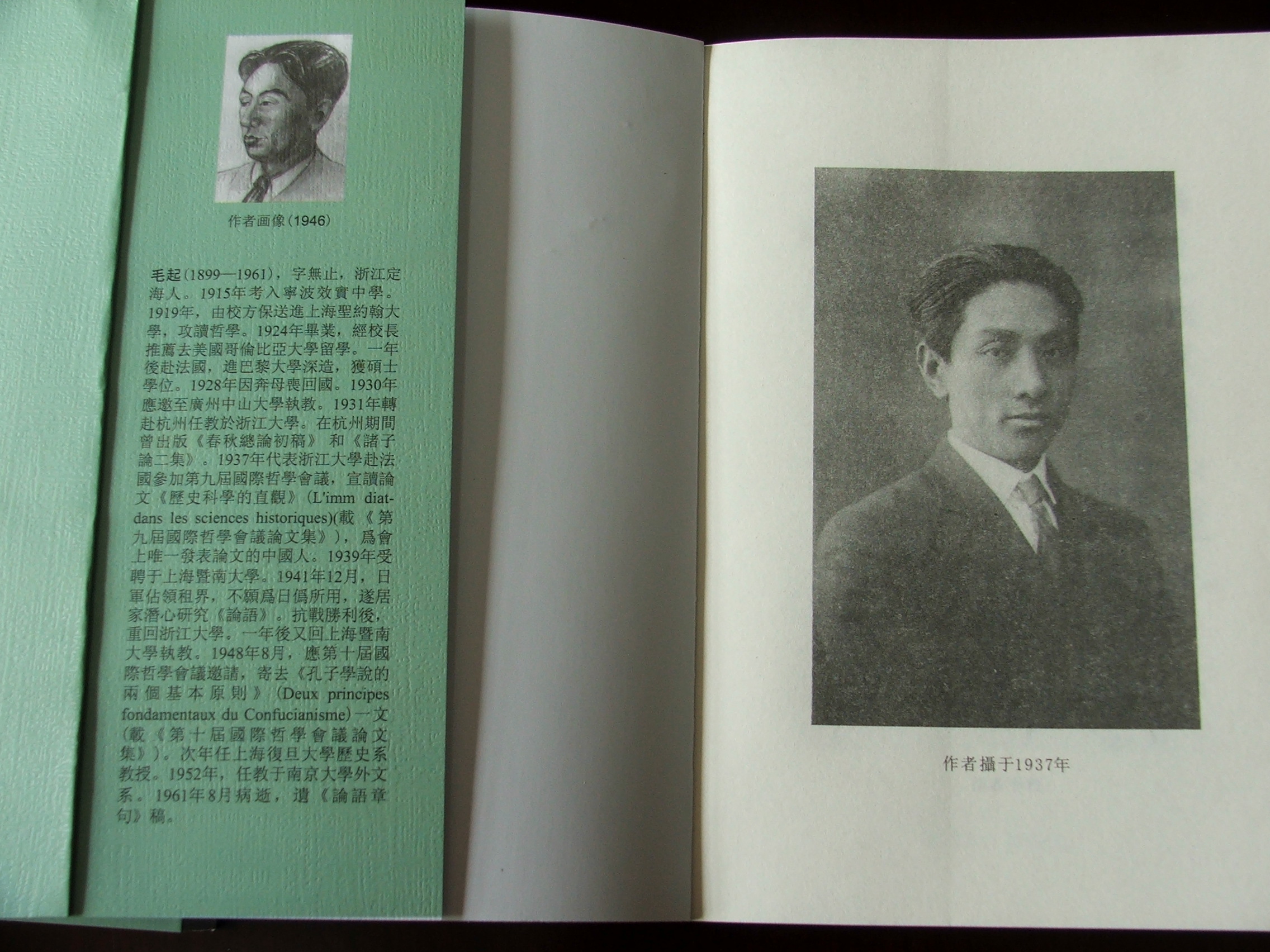 毛起(1899---1961),字无止,浙江定海人。1915年考入宁波效实中学。1919年,由校方保送进上海圣约翰大学,攻读哲学。1924年毕业,经校长推荐去美国哥伦比亚大学留学。一年后赴法国,进巴黎大学深造,获硕士学位。1930年应邀至广州中山大学执教。1931年转赴杭州任教于浙江大学。在杭州期间曾出版《春秋总论初稿》和《诸子论二集》。1937年代表浙江大学赴法国参加第九届国际哲学会议,宣读论文《历史科学的直观》(L’imm diatdans les sciences historiques)(载《第九届国际哲学会议论文集》), 为会上唯一发表论文的中国人。1939年受聘于上海暨南大学。1941年12月,日军占领租界,不愿为日伪所用,遂居家潜心研究《论语》。抗战胜利后,重回浙江大学。一年后又回到上海暨南大学执教。1948年8月,应第十届国际哲学会议邀请,寄去《孔子学说的两个基本原则》(Deux principes fondamentaux du Confucianisme) 一文(载《第十届国际哲学会议论文集》)。次年任上海复旦大学