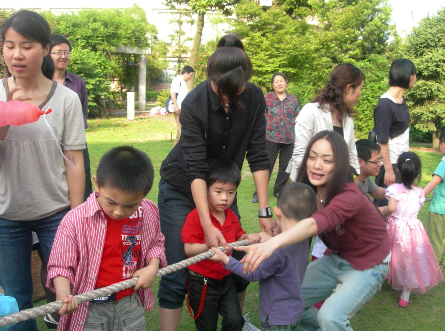 5月31日下午,孩子们品尝了准备好的小点心和水果后,在家长的带领下,来到校园凉亭周围的草坪上参加拔河、小球投篮、寻找宝物、丢手绢等游戏。丰富多彩的户外活动为孩子们提供了更广阔的游乐空间,也让孩子们在收获奖品的同时,收获了欢乐!爸爸妈妈们也被这欢乐的气氛所感染,仿佛回到了自己快乐的童年时代,与孩子们共同玩耍嬉戏。