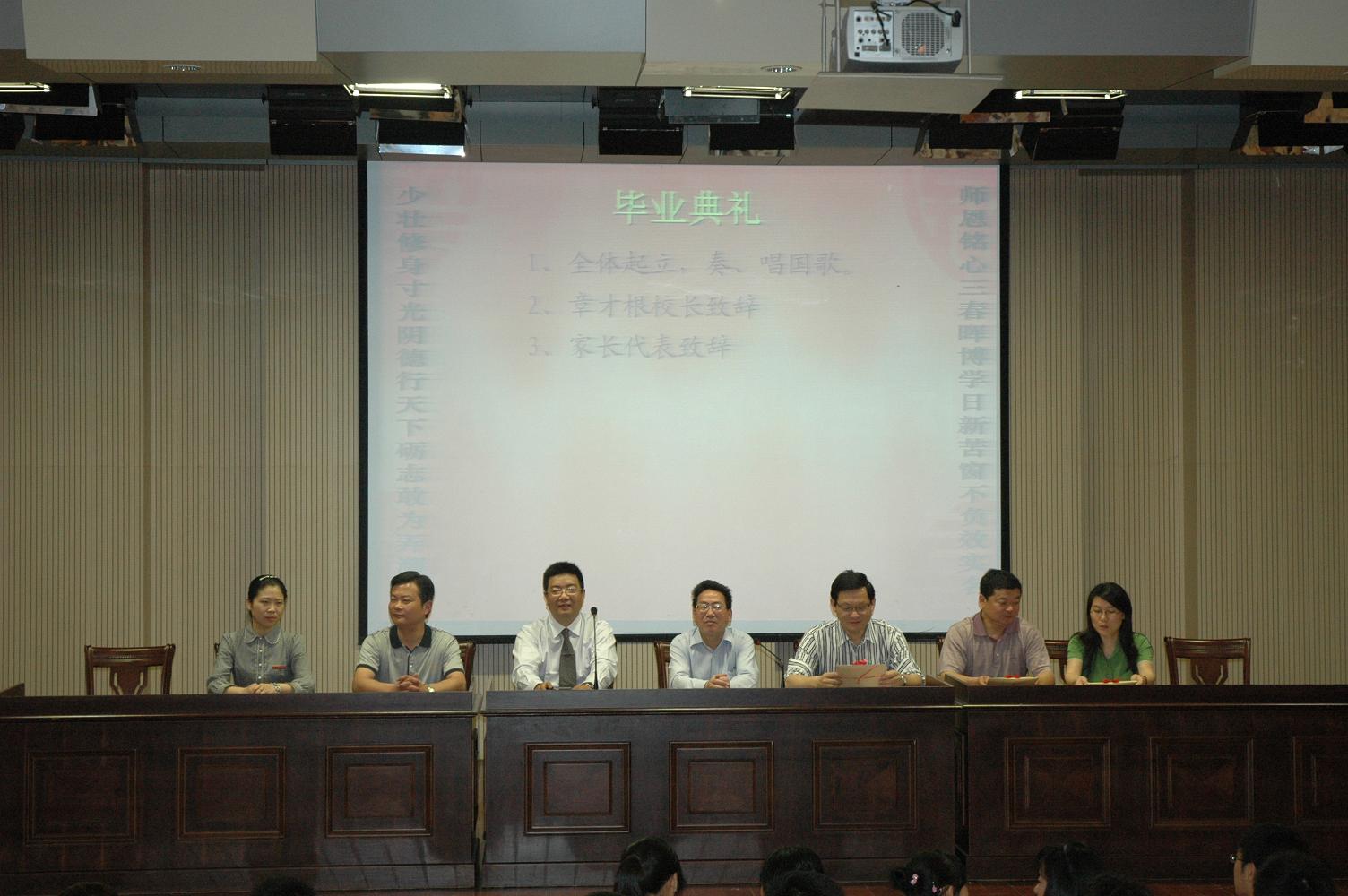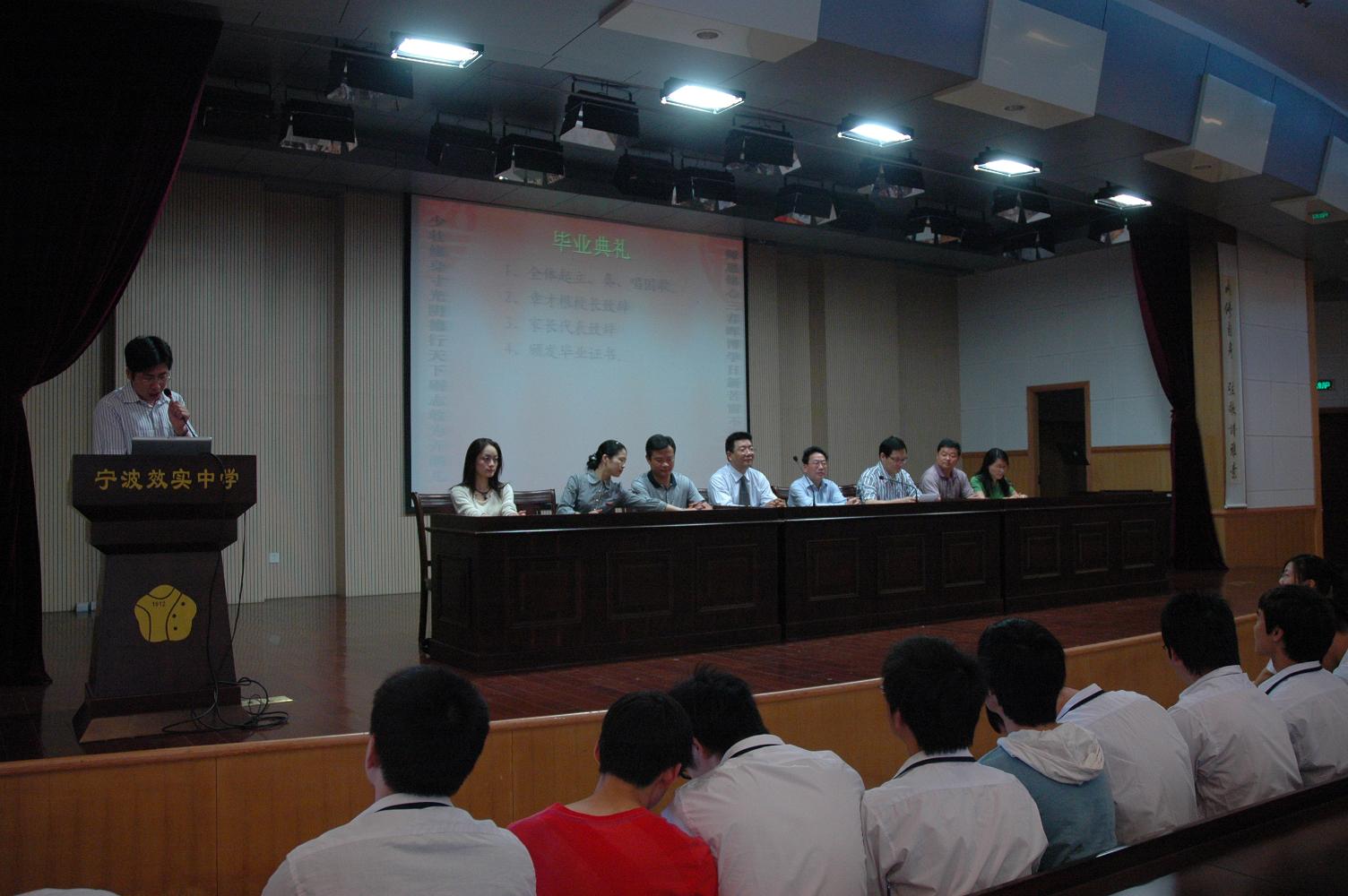 毕业典礼由政教处主任黄荣生老师主持,典礼在雄壮的国歌声中开始。章才根校长首先向631位毕业生表示了祝贺,并和同学们谈了对人生的理解和对效实毕业生的希望,他殷切的告诫自己的学生,一定要增强对祖国、民族、父母、自己的责任感。来自宁波医药高等专科学校的金辉校长,代表所有高三毕业生的家长致辞,吐露了此刻作为家长的喜悦之情,他用“stressed”和“desserts”的变形表明了家长们对高考的客观认识,希望同学们不要把高考的胜败与人生的胜败联系起来,因为“条条大路通罗马”,最后,他用“原共守先正遗训,言忠信,行笃敬,效实储能齐努力,破壁出飞龙”表达了对孩子们的期望。