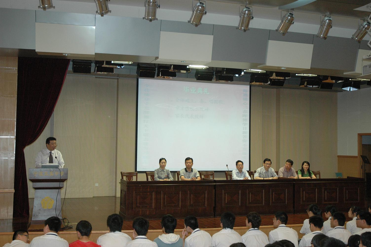 高中生活是一本书,当那一千多页就要匆匆翻过时,每一位身在其中的人和关注它的人都有许多的感慨。527日上午,学校的中山厅被鲜花和红色点缀得一派喜气,而那回荡在会场上空的额尔古纳乐队的《毕业歌》和《二十年后再相会》的旋律,让师生们在新的征程前心潮澎湃。2010届高三全体学生,在这里迎来了属于高中时代的最后一次隆重集会——高中毕业典礼。学校领导、高三班主任和家长代表出席了典礼,见证了这一难忘的时刻。