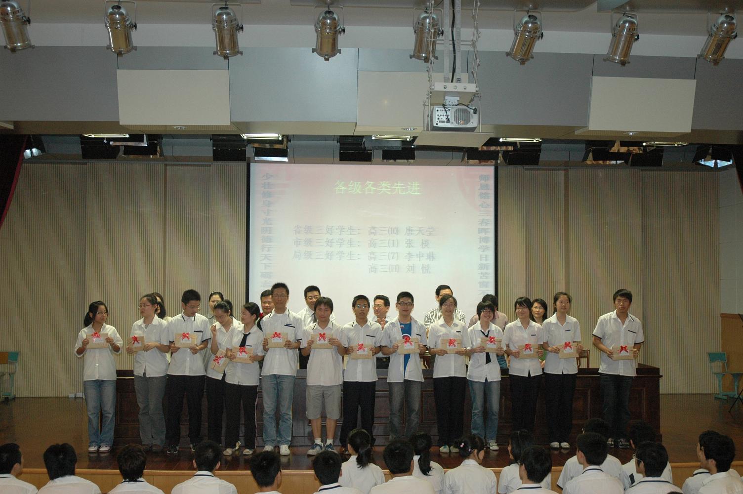 奚增辉副书记随后宣读2009学年度高三年级各级各类先进名单,随后学校领导为这些获得荣誉的同学颁发了奖状。同学们用长时间的掌声为这些努力拼搏的精英们喝彩,他们清楚,一点一滴皆来自于汗水,没有付出,就没有收获。
