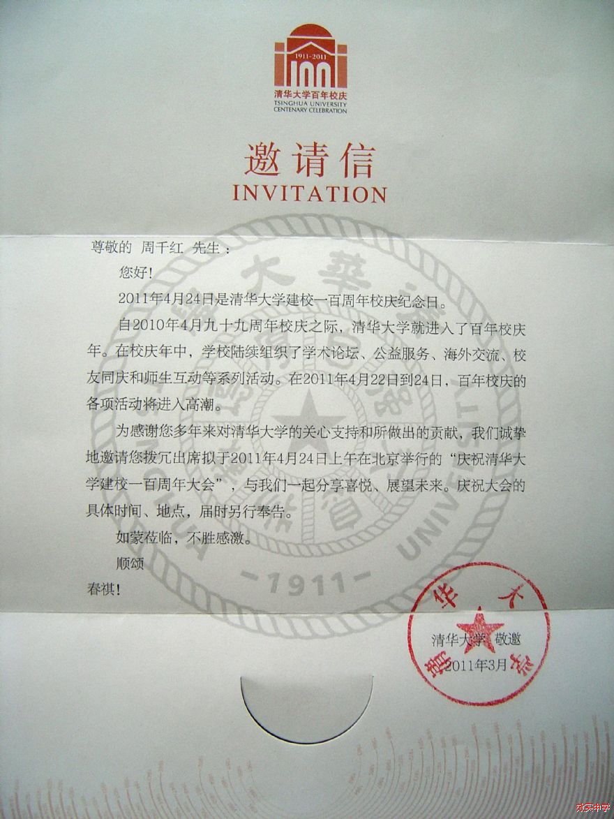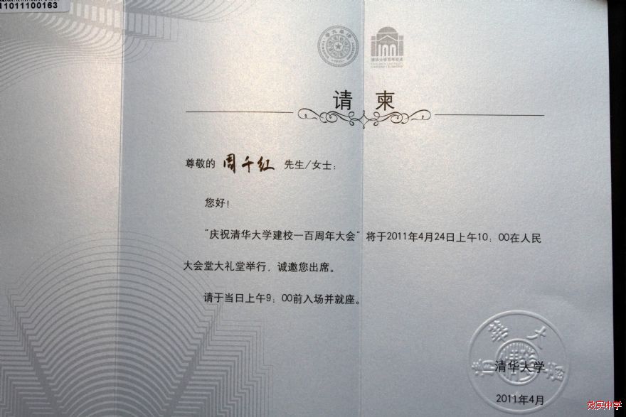 受清华大学的邀请,周千红校长出席了清华大学百年校庆活动。2011年4月24日上午10:00,参加了在人民大会堂举行的“庆祝清华大学建校一百周年大会”。中午,在人民大会堂宴会厅,清华大学校长顾秉林院士宴请了受邀的各位中外高校及中学校长。
