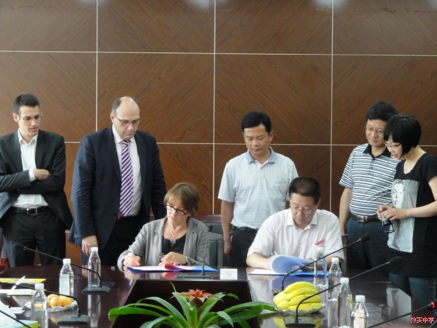 布鲁诺副市长一行随后参观了我校的教学楼。中学地理老师出身的布鲁诺副市长还兴致勃勃地走进我校高一(9)班教室,用英语与学生热情地打招呼:“ I am French”。我校学生迅捷地答上:“We are Chinese”,现场气氛顿时十分欢快。当得知学生不会讲法语时,布鲁诺副市长还站上讲台现场教学生简单的法语会话。我校学生良好的素质给布鲁诺市长留下了深刻的印象。