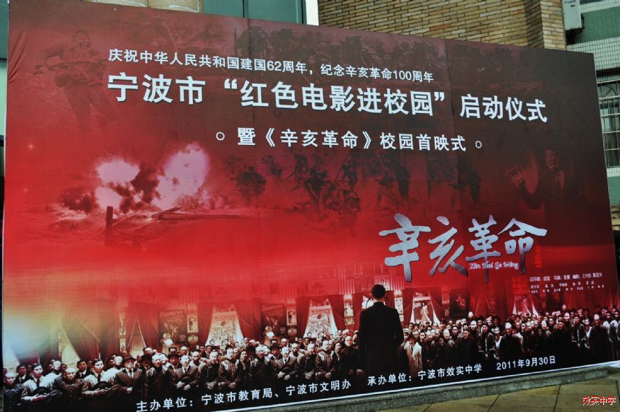 9月30日,由宁波市教育局、宁波市文明办主办,效实中学承办的宁波市“红色电影进校园启动仪式”和“辛亥革命校园首映式”正式拉开帷幕,全校500余师生在中山厅聆听了陈文辉副局长对效实学生的殷切期望,观赏了宁波市电影公司特意播放的数字胶片。使学生较好的接触到了百年前的风云岁月和辛亥志士为振兴中华而矢志不渝、顽强奋斗的爱国精神和“浩气赴事功,置死生于度外”的献身精神。