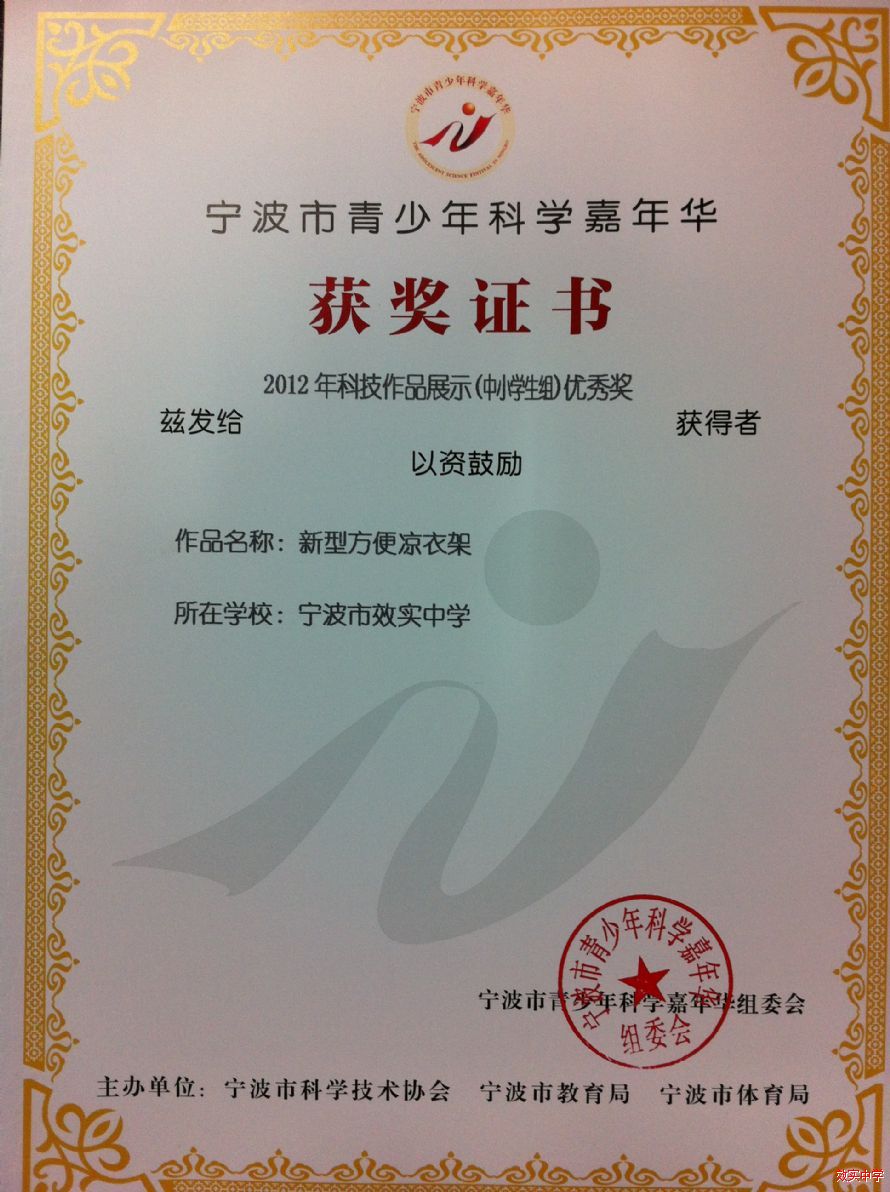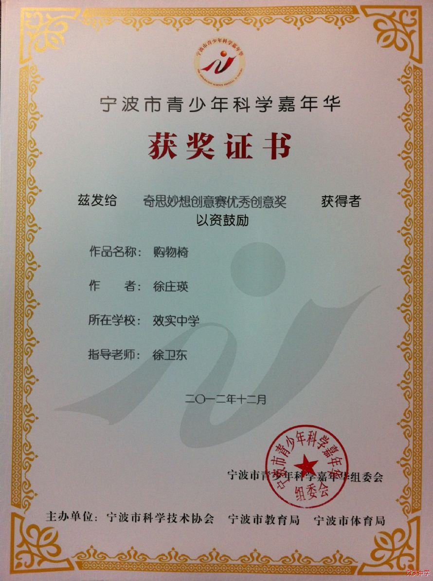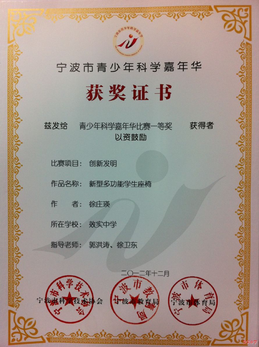 日前,由宁波科协、教育局、体育局主办的宁波市青少年科学嘉年华上我校高二(1)班徐庄瑛同学凭借“新型多功能座椅”、“购物椅”、“新型方便晾衣架”三项发明,获得三项大奖(宁波高中生仅此一人),宁波电视台对此也做了专题报道,再次向徐庄瑛同学表示祝贺!(此前该同学的发明已多次获得国家专利和浙江省一等奖)