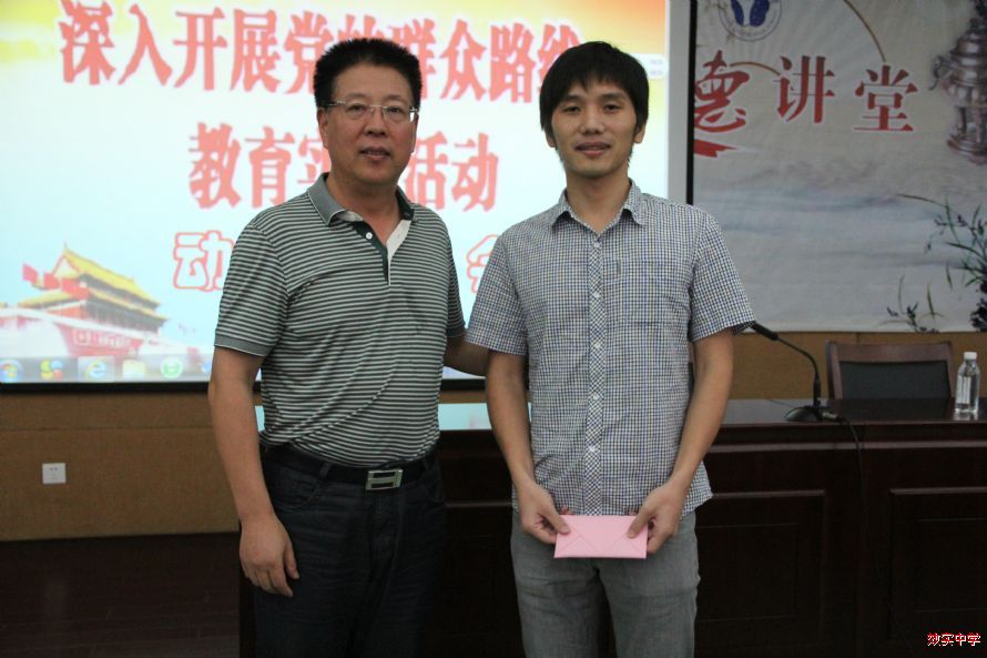 9月6日,我校2013年度校长特别奖颁奖仪式在学校中山厅举行。生物组范少迎老师、政治组陈林福老师获奖,周千红为两位获奖老师颁奖。