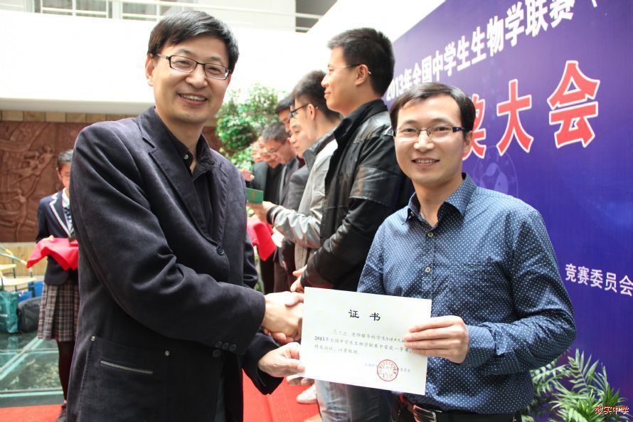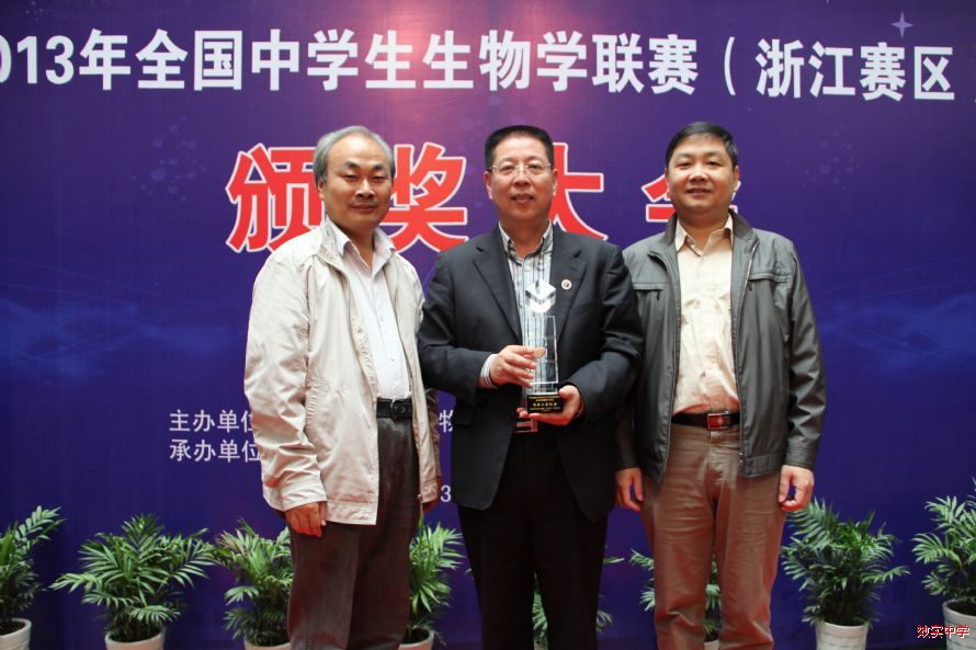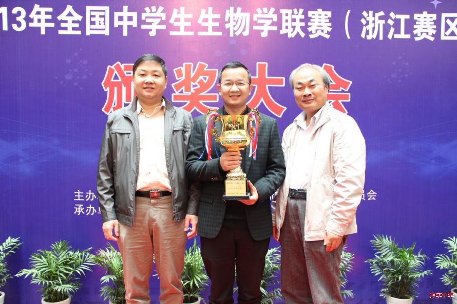 全国中学生生物学联赛每年举行一次。在今年的比赛中,我校学生获得浙江赛区多个一等奖,其中陈心谌同学代表浙江赛区参加全国决赛获得金牌,并入选国家集训队,学校获得团体优胜奖。基于此,省竞赛委员会将本年度联赛颁奖大会交由我校承办。会上,于明坚主任、杨万喜副主任还代表省生物学竞赛委员会,向周千红校长赠送了颁奖大会承办纪念杯。