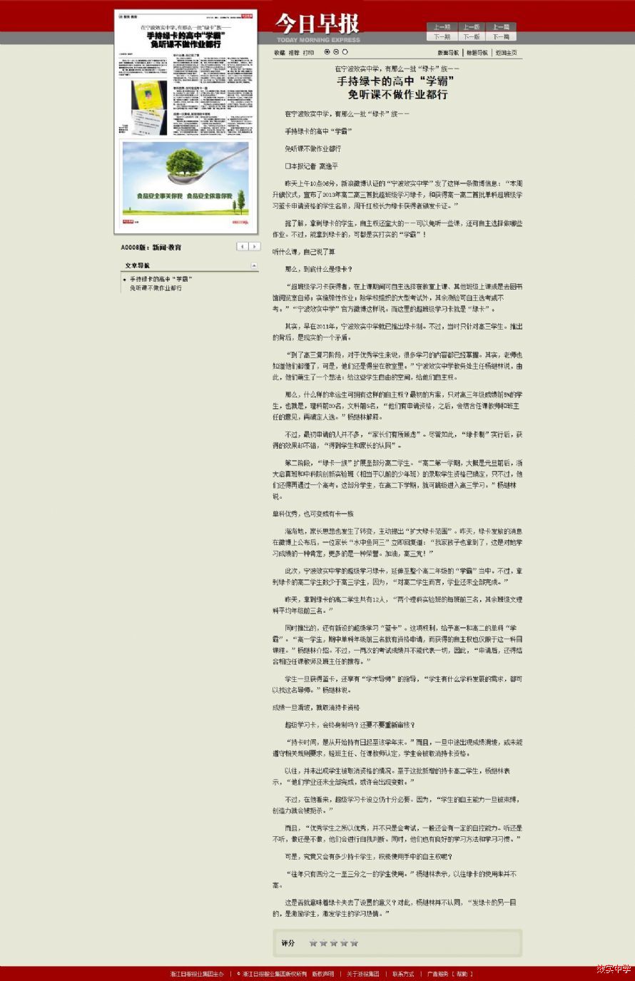 我校超班级学习(绿卡)制度受到媒体高度关注。今天,《今日早报》发布《手持绿卡的高中“学霸”免听课不做作业都行》一文,并被多家著名网络媒体转载。