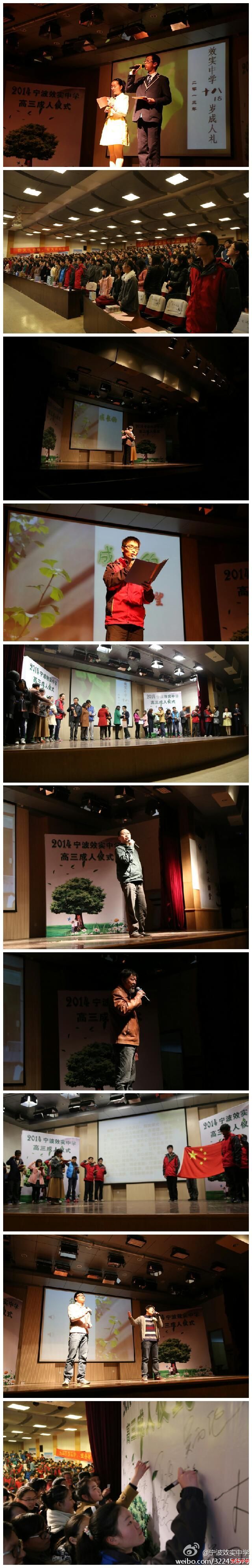 12月13日,2013年度高三年级成人礼在学校中山厅举行。典礼邀请了学校领导、各班班主任老师、家长代表和校友代表参加。同学们在照片中重温了自己的成长经历,在视频中聆听了师长的谆谆寄语,学生代表们还与家长代表们一起,与全体同学分享了自己的成长故事和感悟。本次成人礼还邀请到了98届校友,“效实学子看社会”时事评说奖学金提供者叶骥和72届校友,画家、宁波晚报美术总监、省美术家协会理事、浙江省水彩画家协会副主席、宁波市美术家协会副主席林绍灵。他们对自己的学弟学妹给出了不少建议,告诉他们十八岁要承担的责任和要拥有的激情。详情请点击此链接