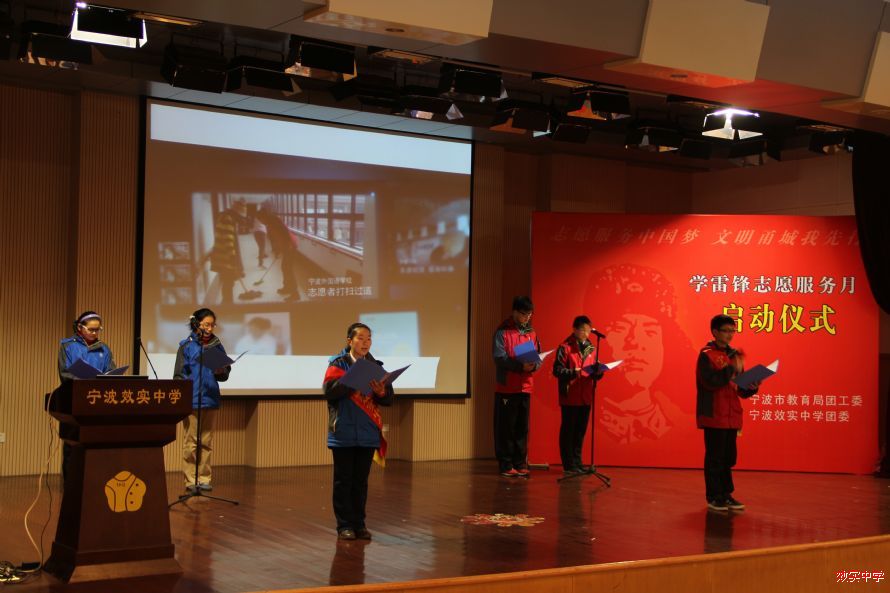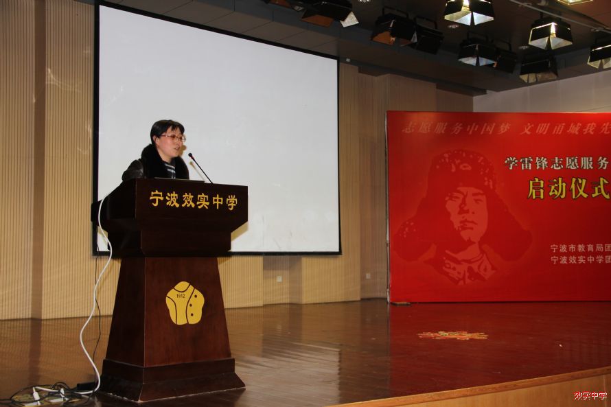 33号下午,2014宁波市中小学生“志愿服务中国梦”学雷锋活动月启动仪式在我校中山厅隆重举行。宁波市教育局副局长徐文姬,宁波市教育局团工委副书记杨周宏,宁波效实中学党委书记胡建军以及各直属学校团委书记,优秀学生志愿者代表出席本次会议。