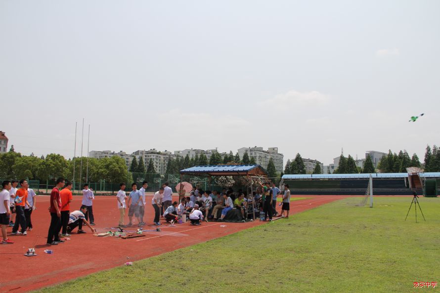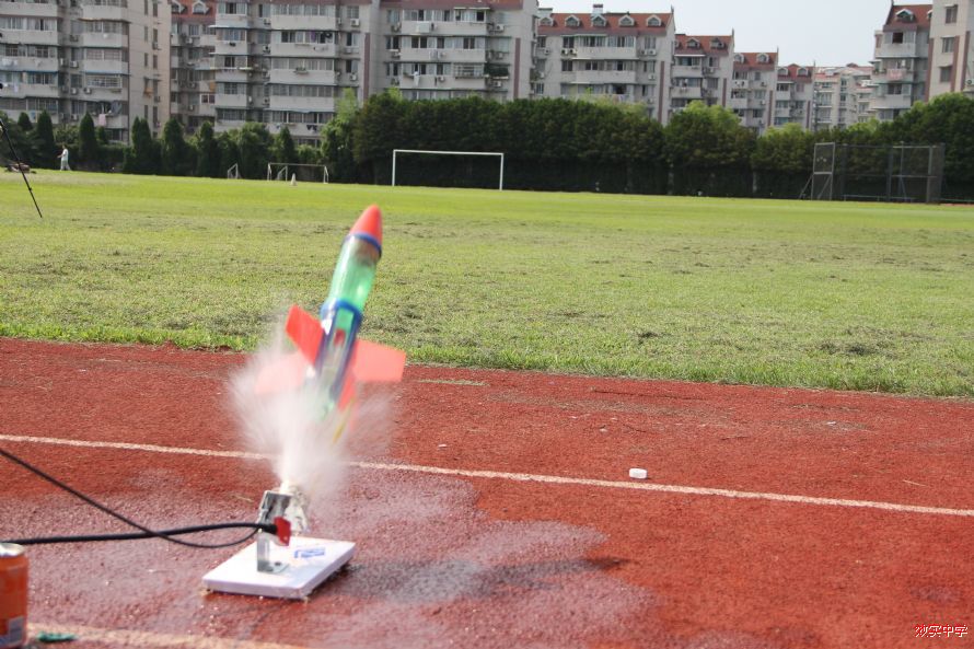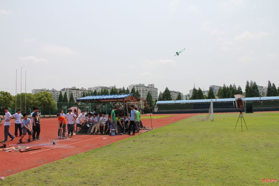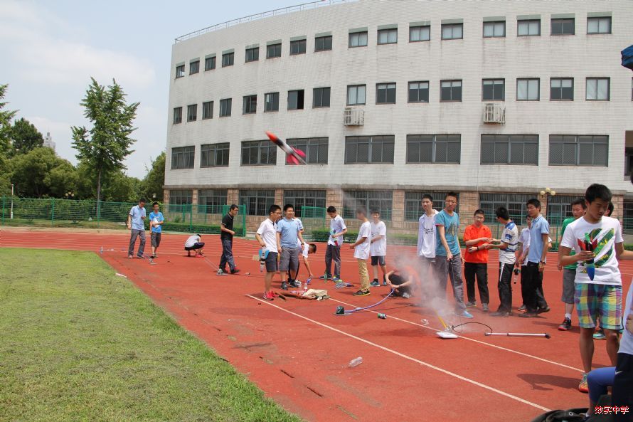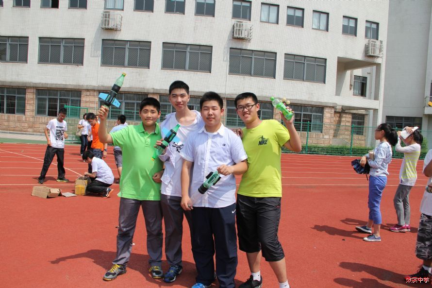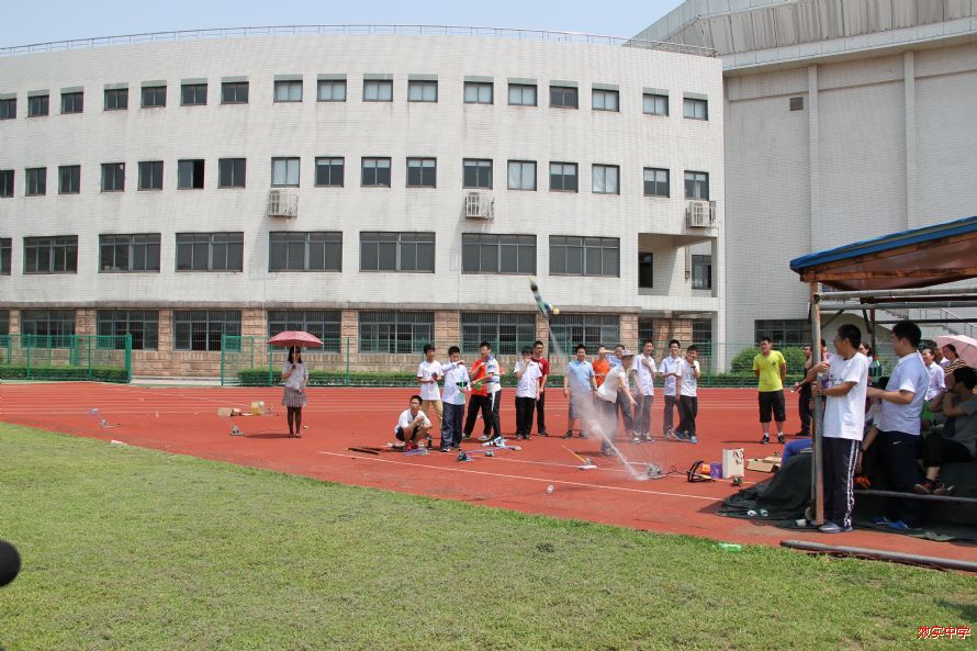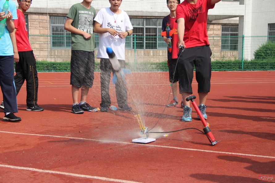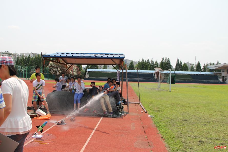 昨天,17届直升班和创新班同学在阳光耀眼的初夏午后,在操场上进行了水火箭比赛。
