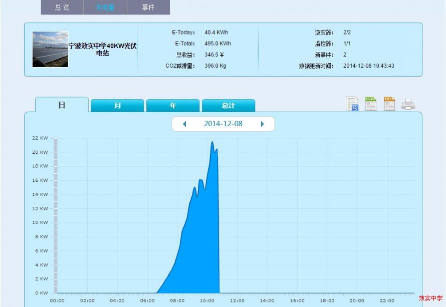 在上级有关部门的监督下,我校必须完成要在现有用能基础上每年递减3%的要求。一方面学校制定相关用电、用气管理制度加以落实,并在师生展开宣传,节约用电、用水;另一方面学校通过技改措施,改造太阳能热水系统、改造灯光系统节约用电,但是随着学校教育事业的发展以及师生生活水平的提高,刚性需求每年在增加,无法满足节能指标,只能通过开源(建设光伏发电)的方式达到上级要求。建成40KV光伏发电站,结合宁波的年太阳辐照总量和天气变化,每年可以发电3万多KHW,可以减少24000KGCO2排放量。光伏发电站采用先进的网络监控技术,通过电脑和手机端APP软件可以实时监测到发电度数和功率。虽然我们采用种种措施,但是我校的节能减排的任务仍十分繁重,需全校师生共同努力节约用电用水。