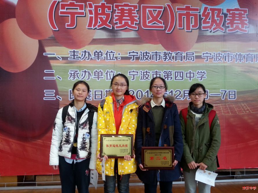 11月,教练应海宏老师带领王晶、张扬、谢轶伦、殷泽恩、余济海、张翀、孙沛儒、王逸琦、许亦鸣、费定、吴仕杰、张辉等同学组成的我校男子篮球队,在2014宁波市直属中学篮球比赛中荣获高中男子甲组第二名。女子排球队也在教练习建平老师的指导和董立晨、陈一抒、董文沁、李悦、蔡元婧、陈熠、陈慰倩、王亚茹、陈慧、王卉及刘欣缘等队员的努力下获宁波市直属中学排球比赛高中女子组第二名。