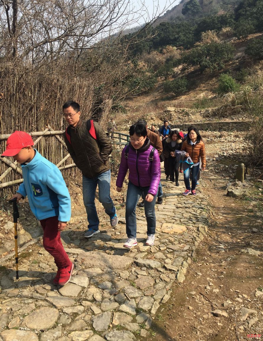 夹岙岭因夹于河头岙和金沙岙之间而得名,是三北军事要道,戚继光曾率兵抗倭路过此地,2012年被评为国家级登山健身步道。一路攀登,虽然有碎石垒成的简陋石阶,但对我们这些平时习惯于电脑和书桌为基本生活方式的缺少锻炼的人来说依旧有些困难。不少人气喘吁吁,汗流浃背。倒是随行家属中的年长者精神矍铄,而充满活力的小孩子们更是欢笑着一路跑到前面去了。虽然累并且“惭愧”着,但看着山中美景,呼吸着市区难得有的新鲜空气,大家还是觉得太值得了。一路上两侧森林植被茂密,种类丰富,有杨梅树、桃花树、毛竹、杉树、马尾松等,沿途景点众多,人为破坏极少,是游人漫步于大自然的一绝佳去处,到岭顶向下望,岭下有大片的茶园,一派秀美山色。