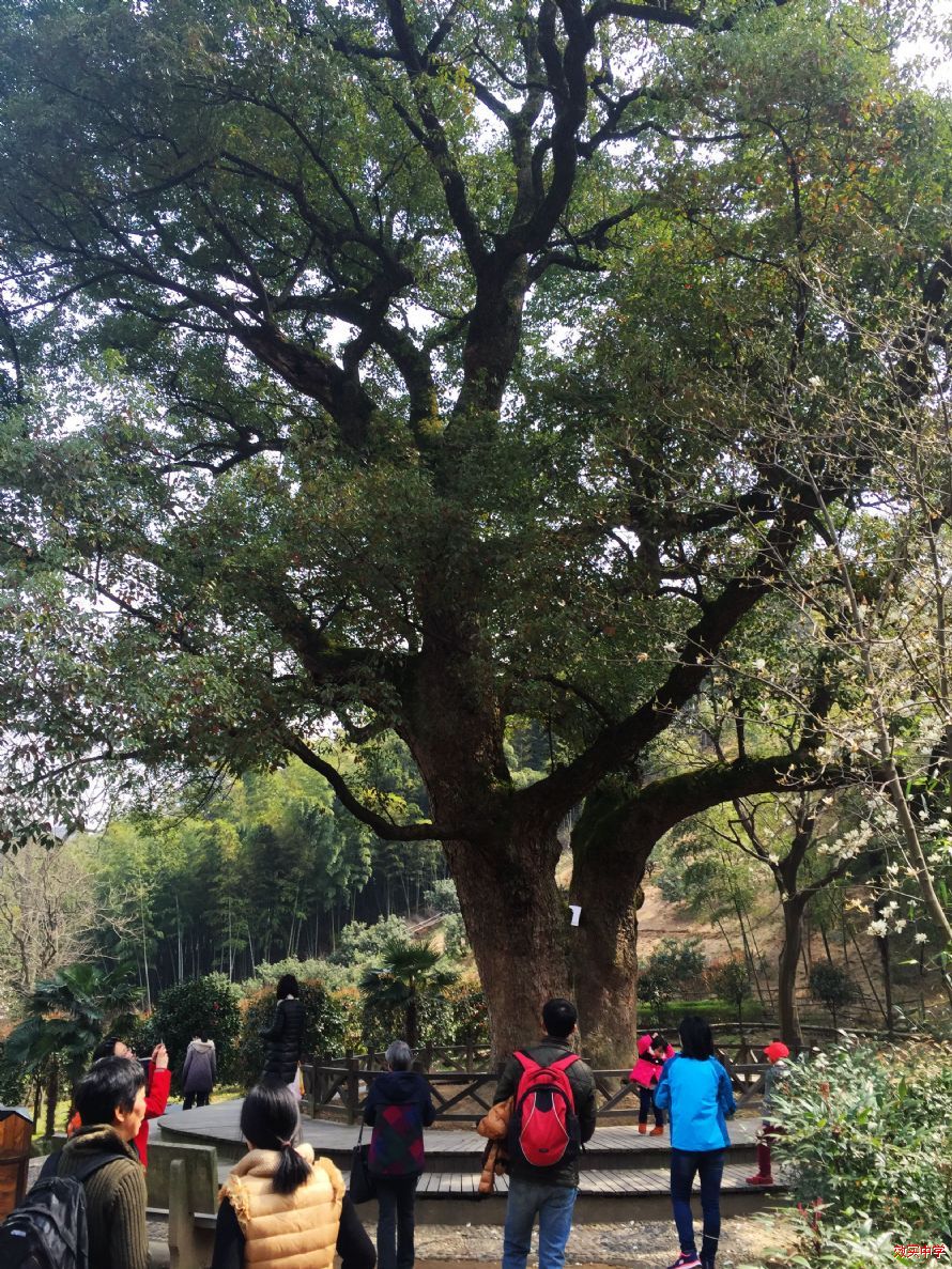 到达山顶后,大家休息片刻,便沿着兰屿古道下山便到了方家河头古村,它三面被灵绪山环抱,地势南高北低,溪涧环村流泻,地下水脉畅盈,遍村古木成荫,踏入“河头”之境,山水之灵气萦人。一棵高30余米的银杏树,树龄700余年,为“浙江省古树名木”之一。还有连理并枝的500岁鸳鸯香樟,更是造型独特,至于百年以上的古树名木则随处可见。如今,河头村人在茂密的竹林之中开出了一块面积12亩的公园,为村民健身休憩之所,人影在树荫下晃动,可谓情趣幽然。古村魅力或许就是一份绿意的包裹,一份静谧的古朴,徒步其中,就此忘怀城市喧嚣。