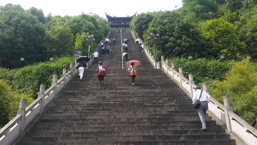 经过两个多小时的车程,大巴车将老师们带到了临海新城中心的灵湖景区。碧波粼粼,清风拂面,大家信步灵湖广场,欣赏音乐喷泉。随后,老师们又来到了临海第一古街——紫阳街。这里是古城的一个缩影,奉仙坊、迎仙坊、白塔桥头、德清巷口……文物古迹随处可见。街道两旁是典型的江南建筑——前店后坊,中间客堂,楼上卧房。老师们一边欣赏古迹,一边流连在各色特产中。午饭后,大家又游览了东湖景区和江南长城。东湖景区亭台楼榭,错落有致,湖光山色,交相辉映。与曲径通幽,一步一景的东湖景区不同,江南长城逶迤曲折,气势恢宏,被称为“江南八达岭”。好汉坡的198级台阶丝毫没有消减“60后”“70后”乃至“80后”们登临的豪情。下午五点多,大巴车安全返回效实中学。欢声笑语中,临海一日游圆满结束。