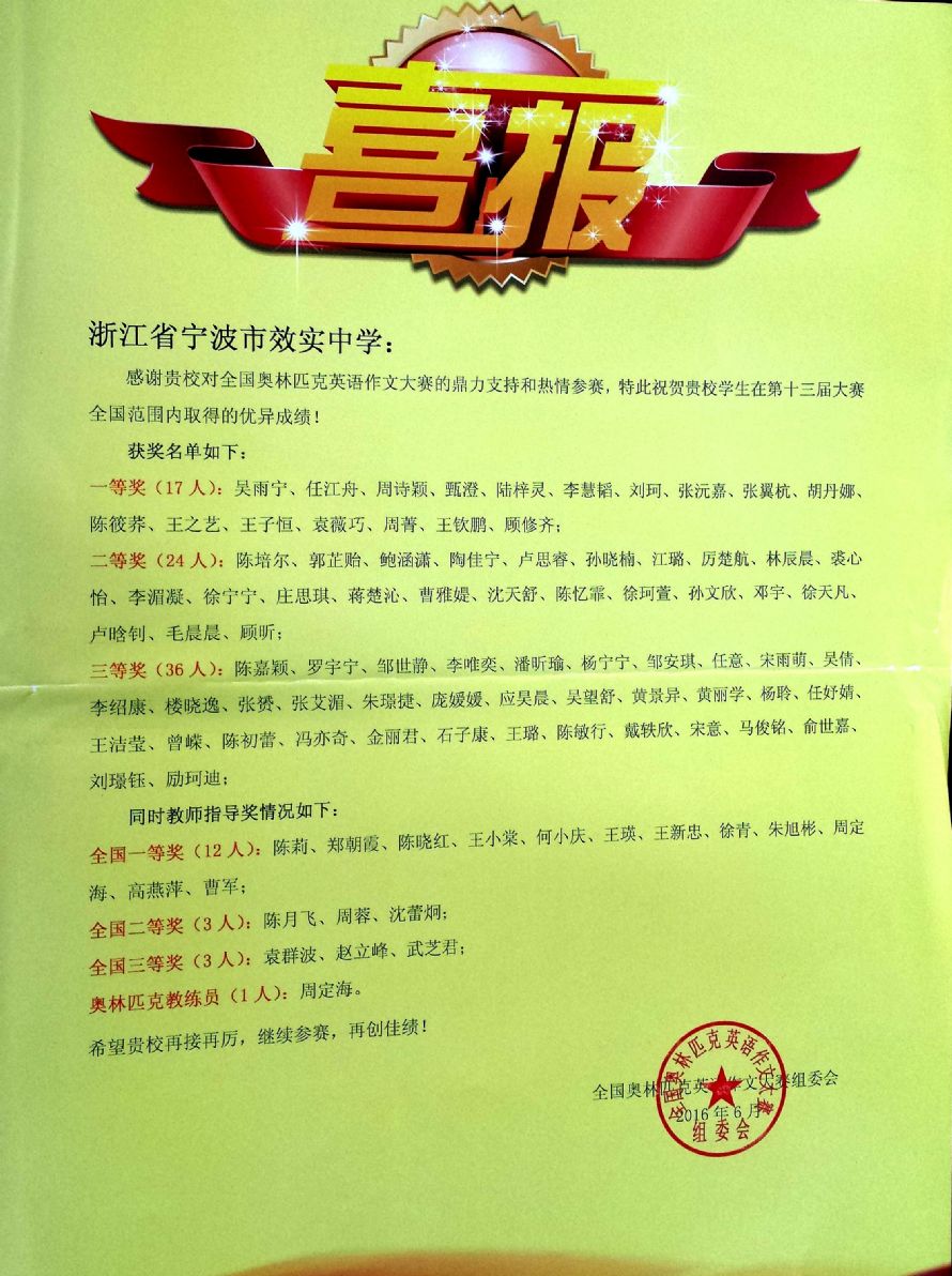 在2016年6月结束的全国奥林匹克英语作文竞赛中,我校多名原高一、高二和高三的学生获奖。其中全国一等奖17人,二等奖24人,三等奖36人。这是我校首次组织该项目的比赛,在同学们的努力和指导教师的精心指导下,同学们的作品得到了评委会的肯定,获得了优秀的成绩。在此向获奖的同学们表示祝贺,向指导教师们表示感谢!
