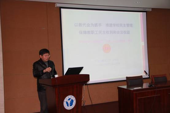 胡主席的报告分为教代会的职权和组织体系,新时期为什么更加重视中小学教代会工作和怎样开好中小学教代会三部分,并围绕中小学如何开好教代会这一重点进行了展开。报告首先通过回顾教代会制度的历史演变,明确了教代会能干什么的问题,把教代会的八项职权归纳为讨论建议权、审议通过权、评议监督权,并通过身边的案例进行生动说明;二是深度阐述了教代会与党组织、校长室和工会之间的关系,突出了教代会是学校民主管理中最根本、最重要的形式;三是为教代会如何开展工作提供很多具有操作性的建议;四是向我们梳理了“三个坚持”、“三个必须”和“掌握好分寸”的代表履职义务;最后结合我校十一届一次教代会的建议和提案特点对代表写好提案进行了重点指导。