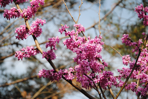 赤城山因其山赤,石屏列如城而得名,是天台山中惟一的丹霞地貌景观。在登山道两边,紫荆花烂漫怒放,艳丽的花朵密集地爬满了整棵树的每个枝条,格外引人瞩目。