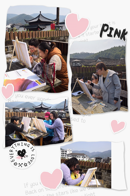 在大堰村特色民宿尽享本真风味之后,活动分手绘油画和参观历史文化名村两个项目进行。十多位老师在名宿的露台上,由沈红老师指导体验手绘油画,一笔一画,不同色彩配置都体现了每一位作者的创意,大家互相交流着,实践着,将近2个小时的创作,一幅作品基本成型,站在画板前凝视,好有成就感哦。