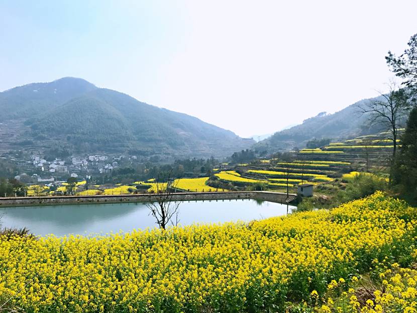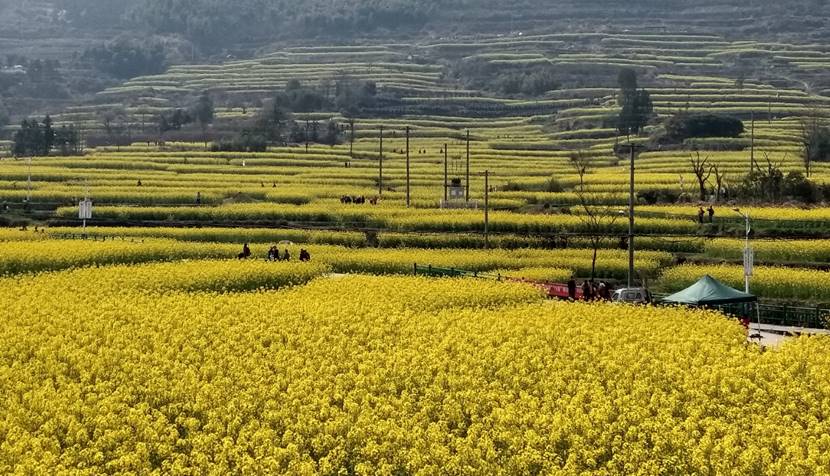成片怒放的油菜花,阳光下金灿灿的,悦目耀眼,与远处的白墙灰瓦民居相映成趣。在花海中穿梭、留影、谈天,让人忘却了烦与恼,只有眼前的美景与脚下的泥土。