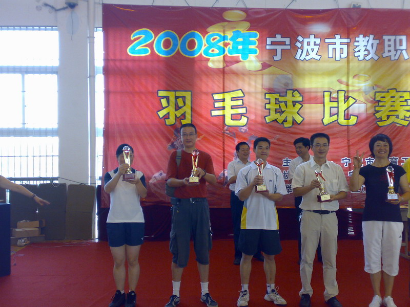 9月23-24日,由宁波市教育工会主办的“2008年直属学校教职工羽毛球普、职高组比赛”在宁波经贸学校体育馆举行。本次比赛有19个直属学校组队参加,比赛采用四小组循环赛制。我校队员夏炳、钟竞天、王莉敏和何博纳顽强拼搏、勇于争先,赛出了水平、赛出了风格,最终夺得团体比赛第2名。夏炳获得个人第3名。