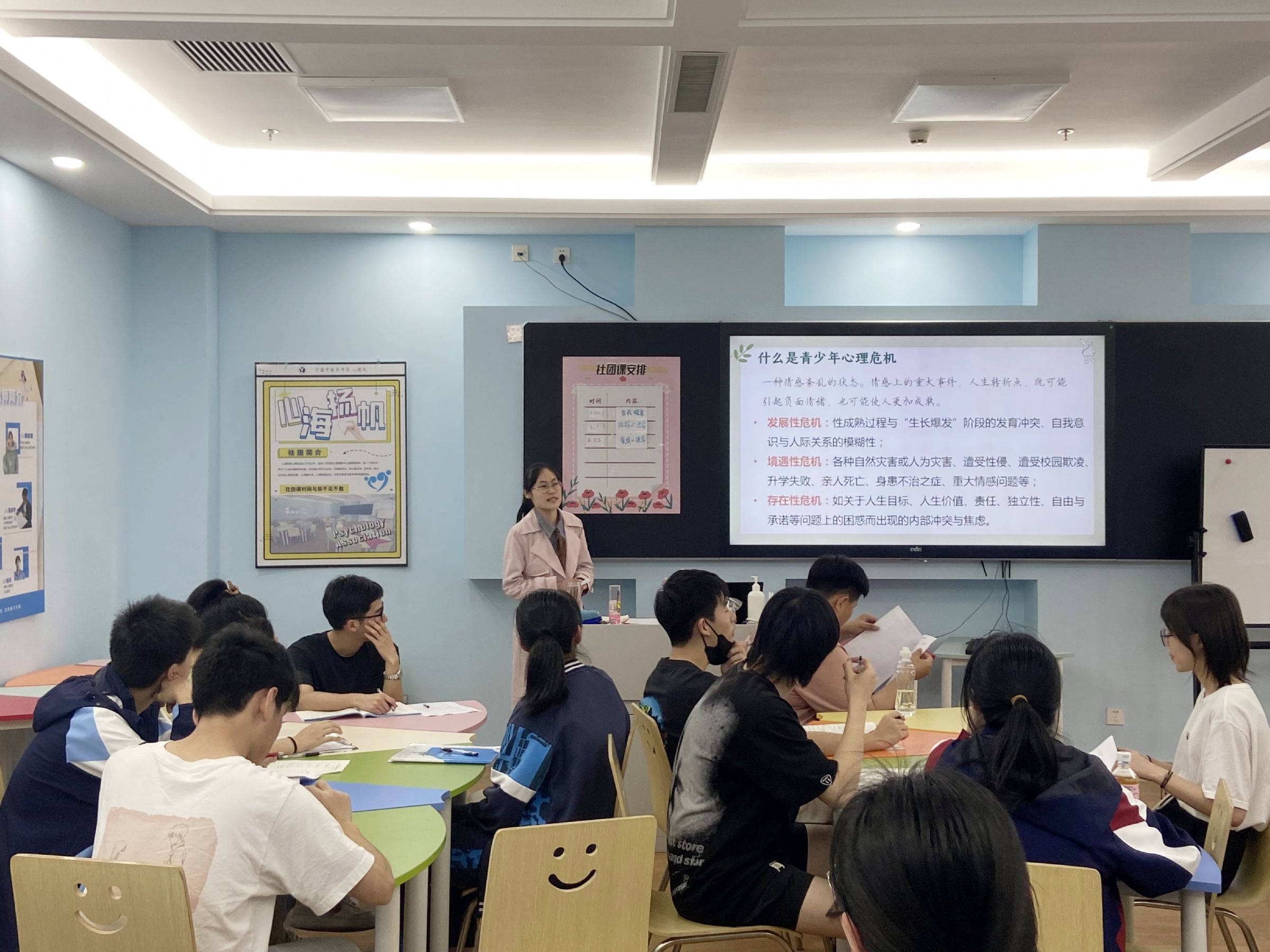 2023年4月18日中午,我校心灵港湾心理辅导中心在下沉广场011心理教室召开了心理委员培训会议。专职心理老师周老师、心理代课老师潘老师,以及全校的心理委员们出席了本次会议。会议的主要内容包括青少年心理危机识别与心理健康知识的培训,以及下半学期心理委员的工作安排。
