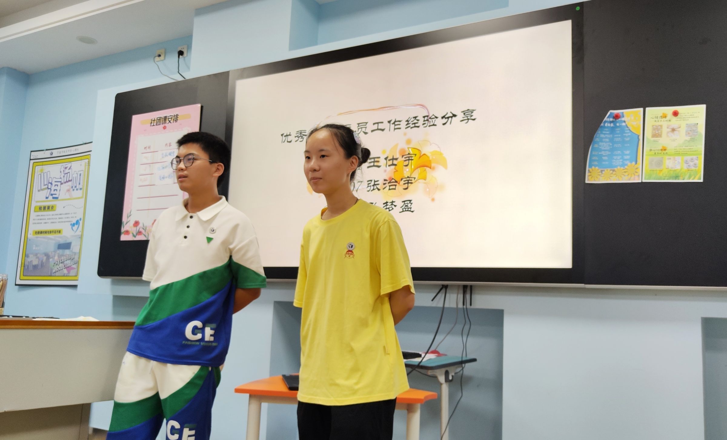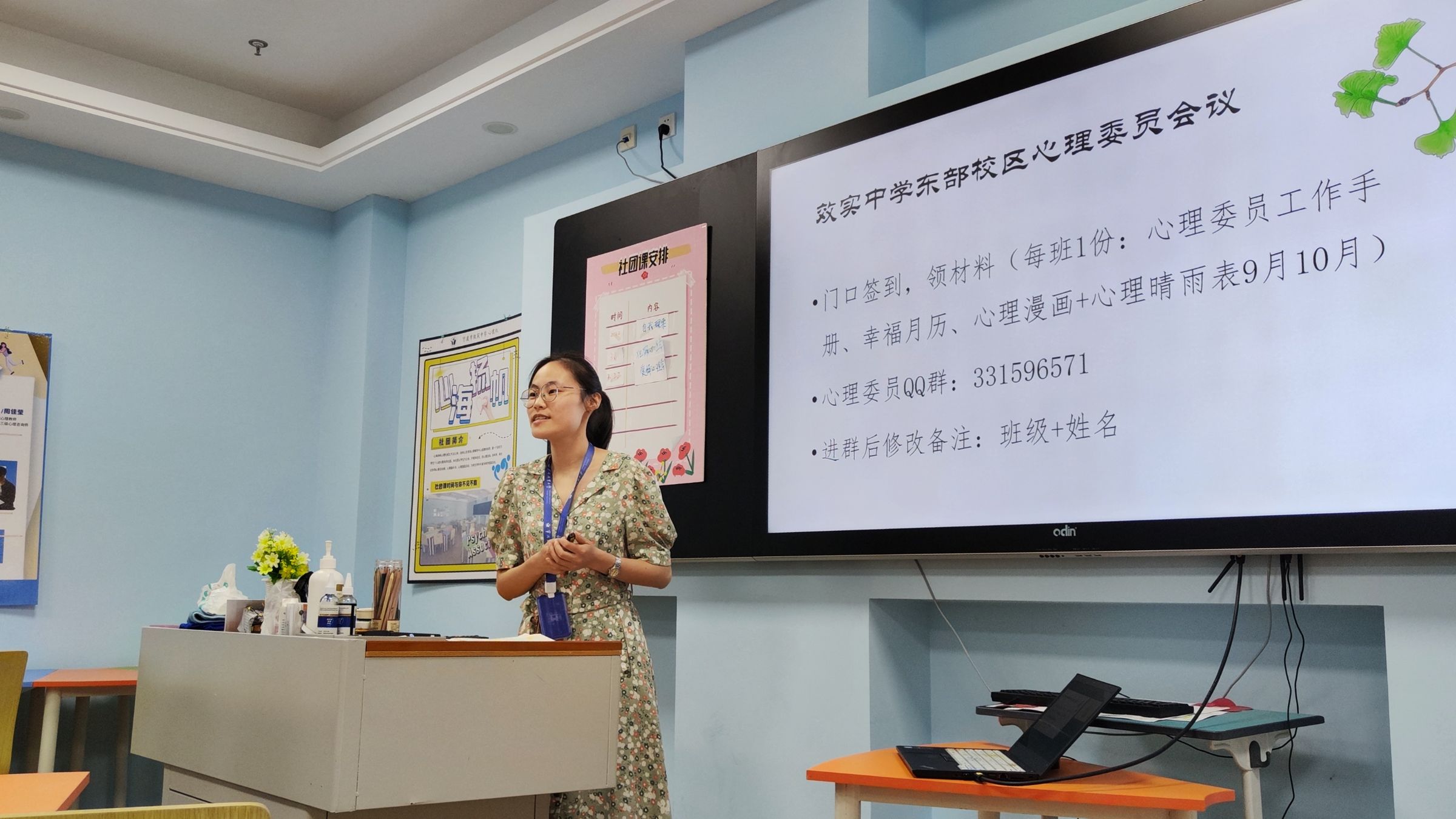 东部校区,周老师向心理委员发放了《心理委员工作手册》、心理漫画、幸福月历和心理晴雨表,欢迎了新加入心理委员队伍的高一同学们,并讲解了心理委员的职责、心理晴雨表的填写方法、本学期的工作安排等。来自D2507的张治宇和孔梦盈作为优秀心理委员代表暨年级心理联络员,向大家分享了一年来作为心理委员的工作经验与感悟,在心理委员群体中起到了很好的引领作用。
