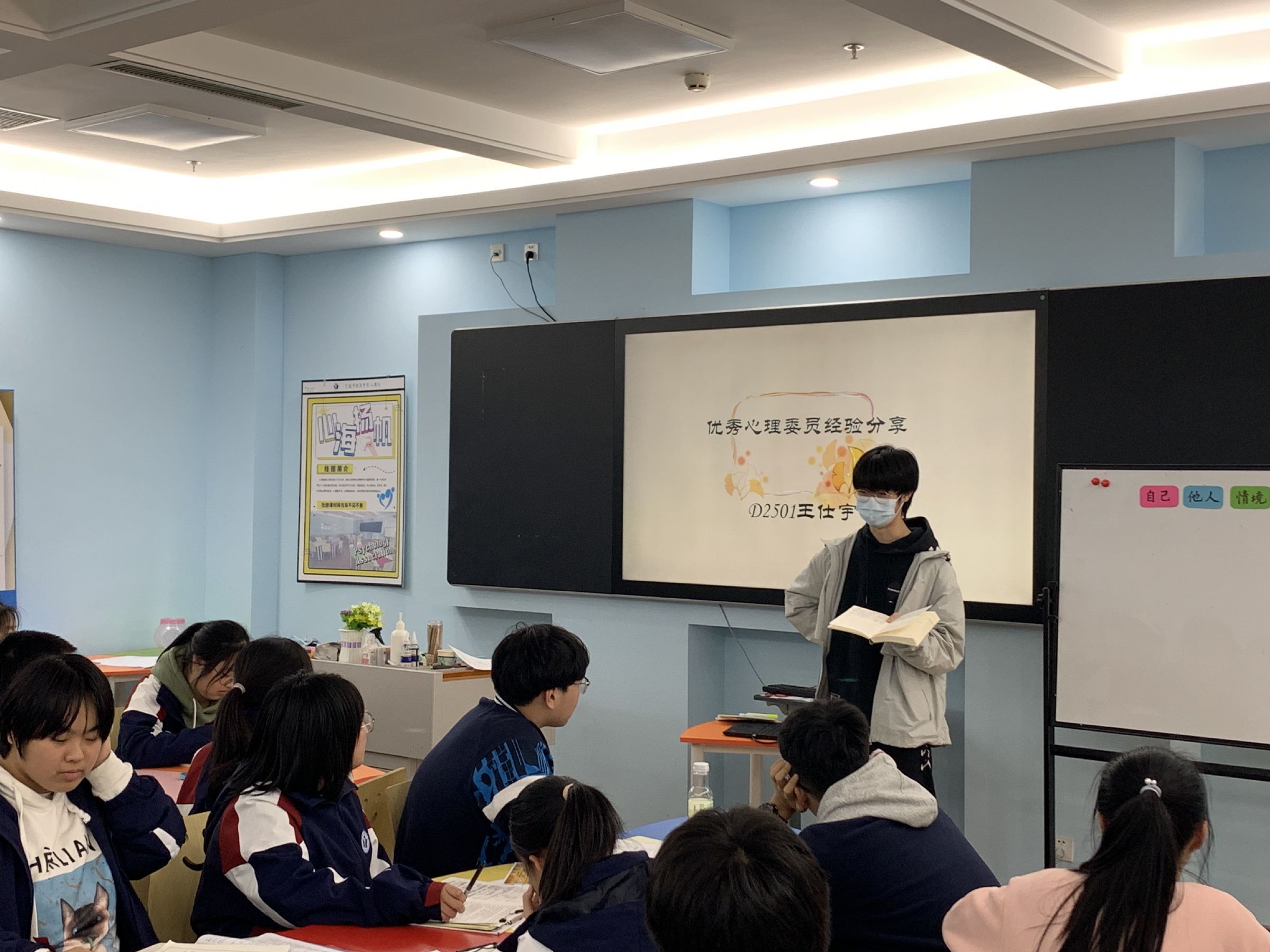 本次会议邀请了D2501王仕宇同学作为优秀心理委员代表给高一高二的心理委员同学们进行经验分享,王仕宇同学充满热情,在心理委员工作过程中认真负责,在每月心理晴雨表的反馈中颇有心得,提出了很多实用的建议。