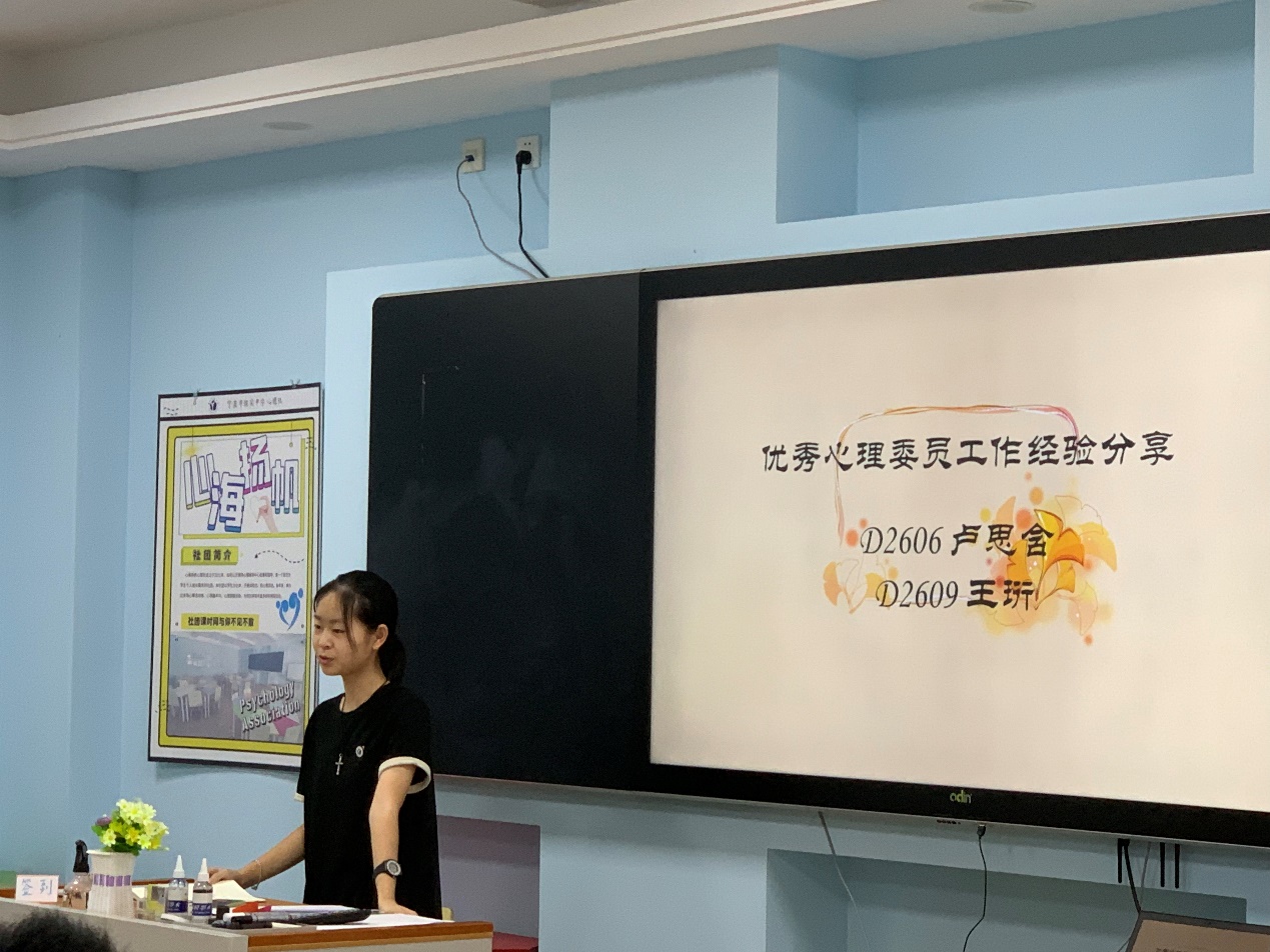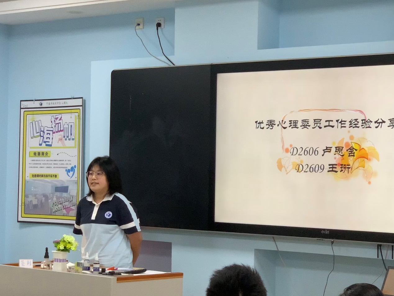 在经验分享环节,D2606班的卢思含同学和D2609班的王珩同学作为年级心理联络员和优秀心理委员代表,分享了他们一年来的工作经验。
