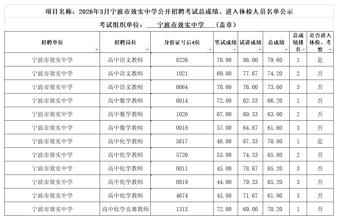 2026年3月宁波市效实中学公开招聘考试总成绩、进入体检人员名单公示