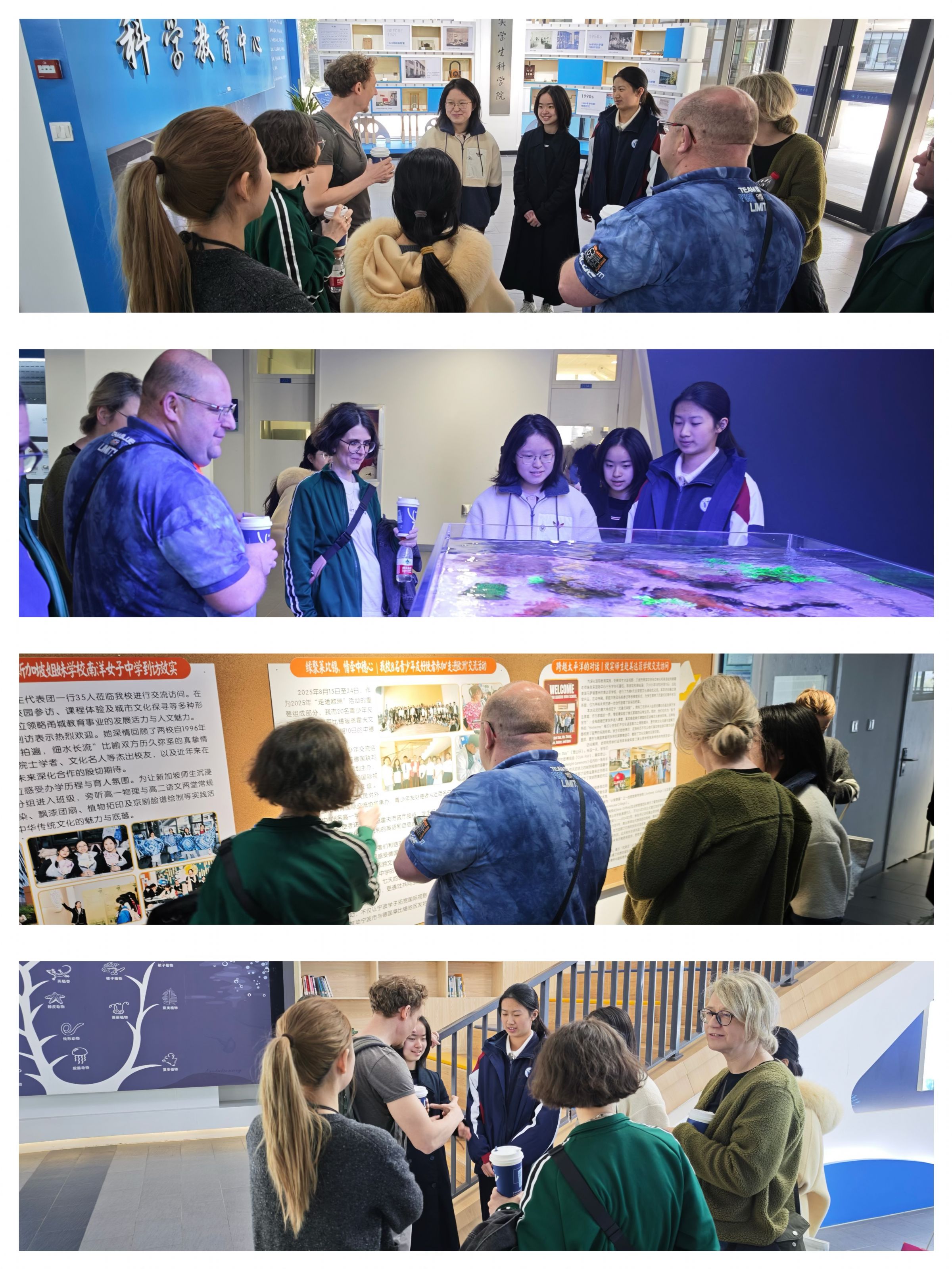 当天上午,诺恩霍夫高级文理中学的回访团教师代表一行先后参观了杰出校友浮雕墙、科学教育中心、海洋生物展示馆、物理学科走廊等地。在走访过程中,代表团对学校悠久的办学历史、浓厚的文化氛围以及富有前瞻性的科学教育理念表示了高度的赞赏。